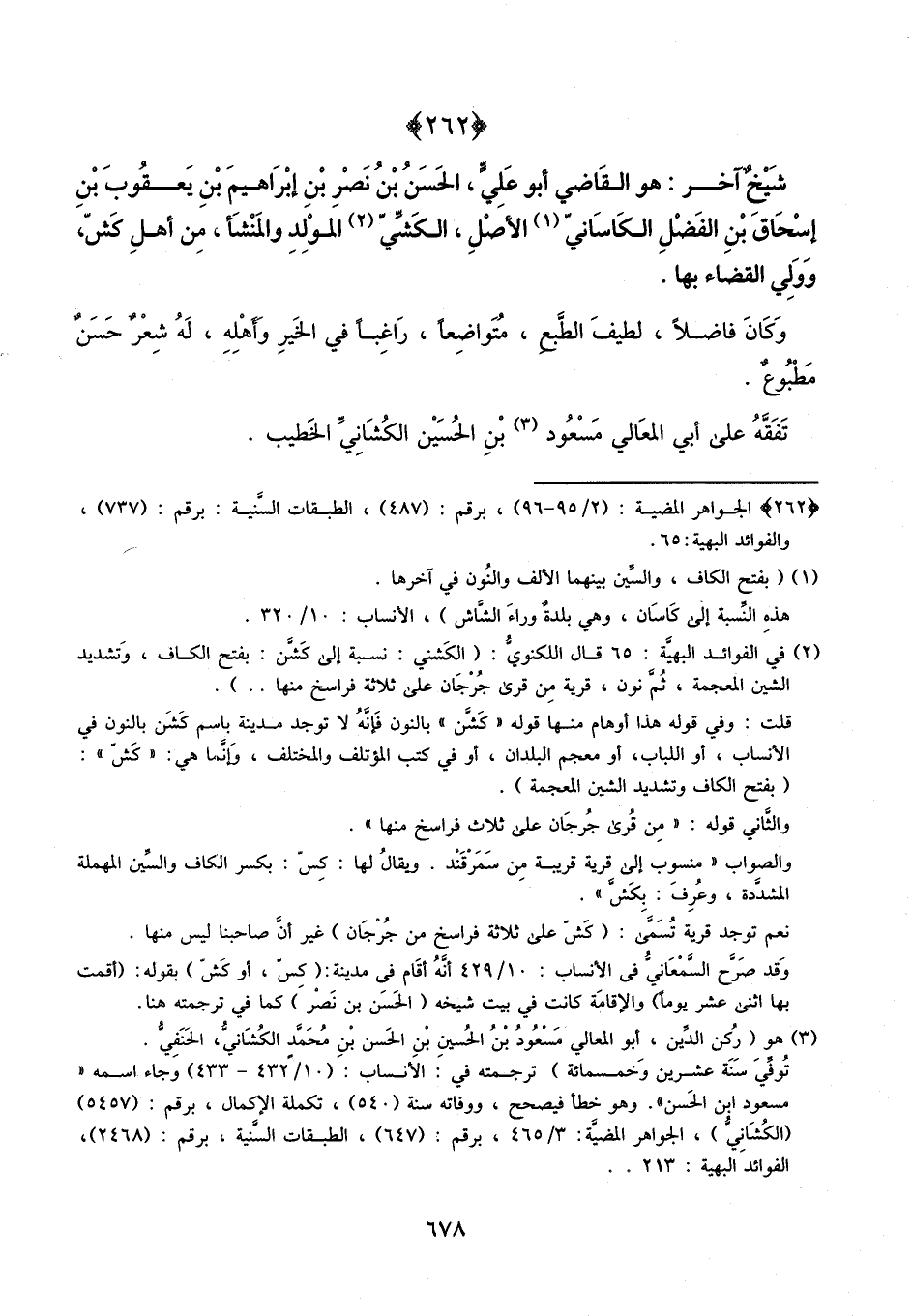 شيخ آخر: هو القاضي أبو علي الحسن بن نصر بن إبراهيم بن يعقوب بن إسحاق بن الفضل الكاساني الأصل الكشي، المولد والمنشإ