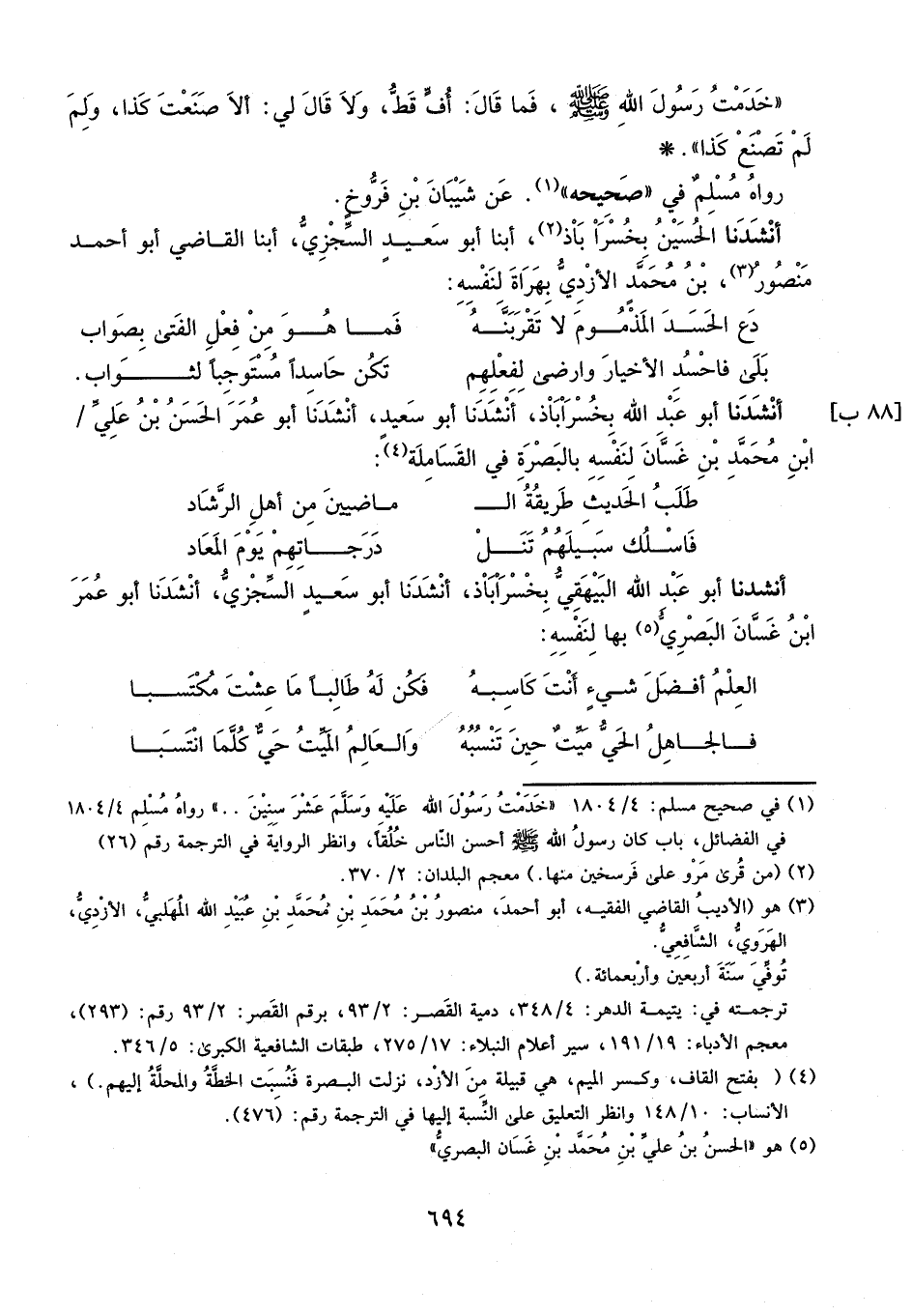 أنشدنا الحسين بخسراباذ، أبنا أبو سعيد السجزي، أبنا القاضي أبو أحمد منصور بن محمد الأزدي بهراة لنفسه: