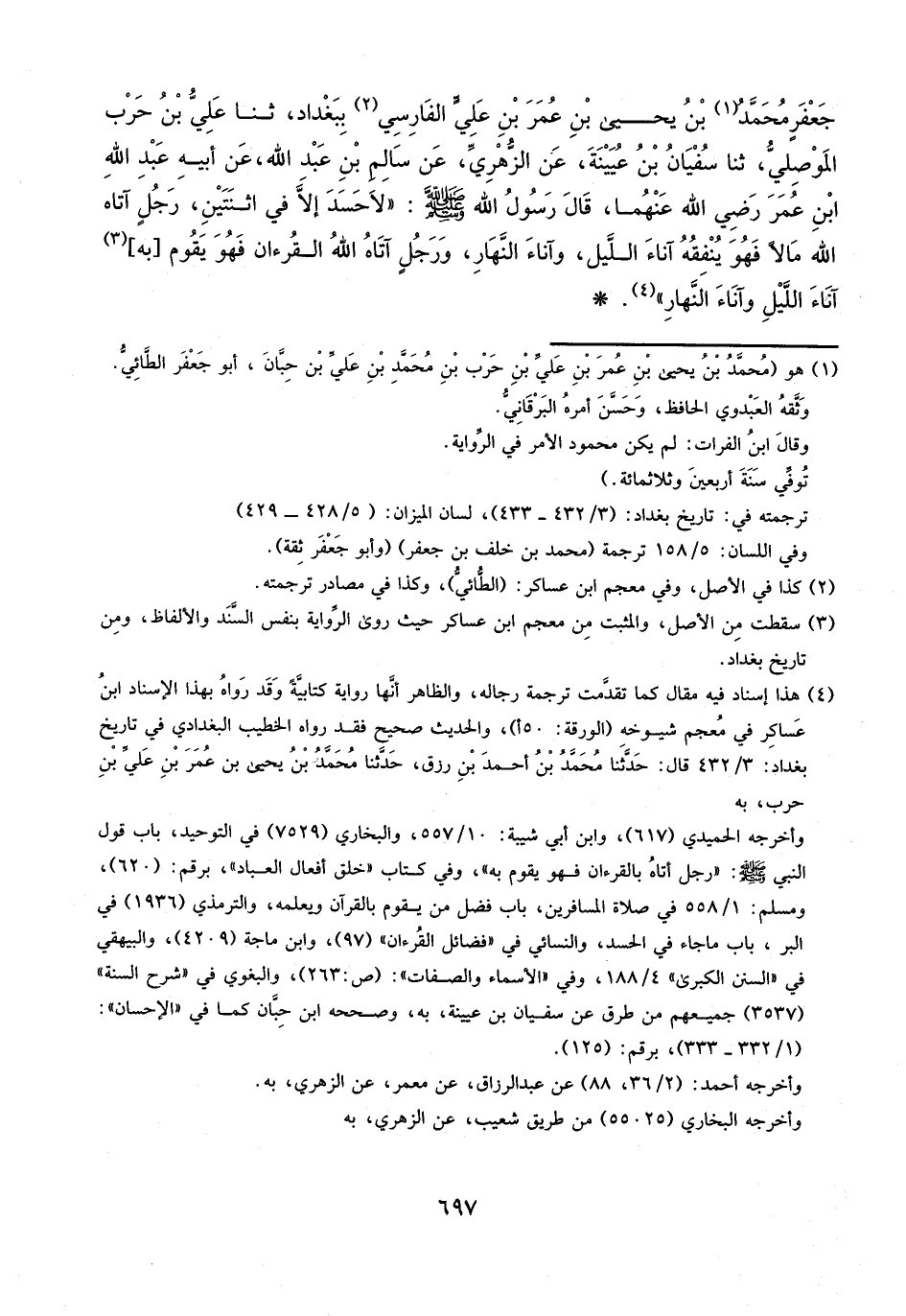 جَعْفَرٍ مُحَمَّدُ بْنُ يَحْيَى بْنِ عُمَرَ بْنِ عَلِيٍّ الْفَارِسِيُّ بِبَغْدَادَ، ثَنَا عَلِيُّ بْنُ حَرْبٍ الْمَوْصِلِيُّ، ثنا سُفْيَانُ بْنُ عُيَيْنَةَ، عَنِ الزُّهْرِيِّ، عَنْ سَالِمِ بْنِ عَبْدِ اللَّهِ، عَنْ أَبِيهِ عَبْدِ اللَّهِ بْنِ عُمَرَ، رَضِيَ اللَّهُ عَنْهُمَا، قَالَ رَسُولُ اللَّهِ، صَلَّى اللَّهُ عَلَيْهِ وَسَلَّمَ: «لا حَسَدَ إِلا فِي اثْنَتَيْنِ؛ رَجُلٌ آتَاهُ اللَّهُ مَالًا فَهُوَ يُنْفِقُهُ آنَاءَ اللَّيْلِ وَآنَاءَ النَّهَارِ، وَرَجُلٌ آتَاهُ اللَّهُ الْقُرْآنَ فَهُوَ يَقُومُ بِهِ آنَاءَ اللَّيْلِ وَآنَاءَ النَّهَارِ» .