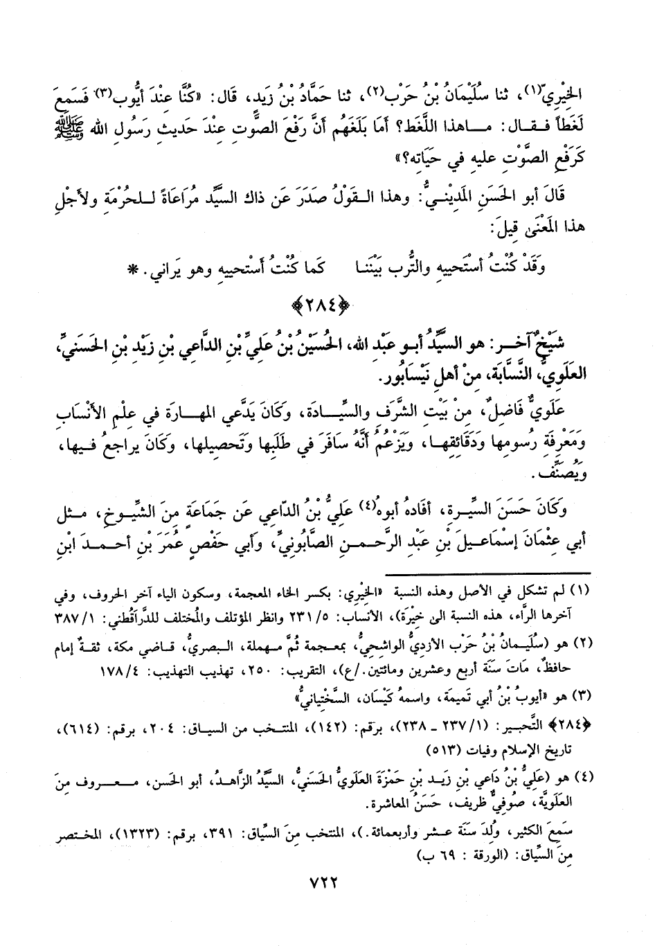 الخيري، ثنا سليمان بن حرب، ثنا حماد بن زيد، قال: كنا عند أيوب فسمع لغطًا، فقال: ما هذا اللغظ؟ أما بلغهم أن رفع الصوت عند حديث رسول الله، صلى الله عليه وسلم، كرفع الصوت عليه في حياته؟ ، قال أبو الحسن المديني: وهذا القول صدر عن ذاك السيد؛ مراعاة للحرمة، ولأجل هذا المعنى قيل: