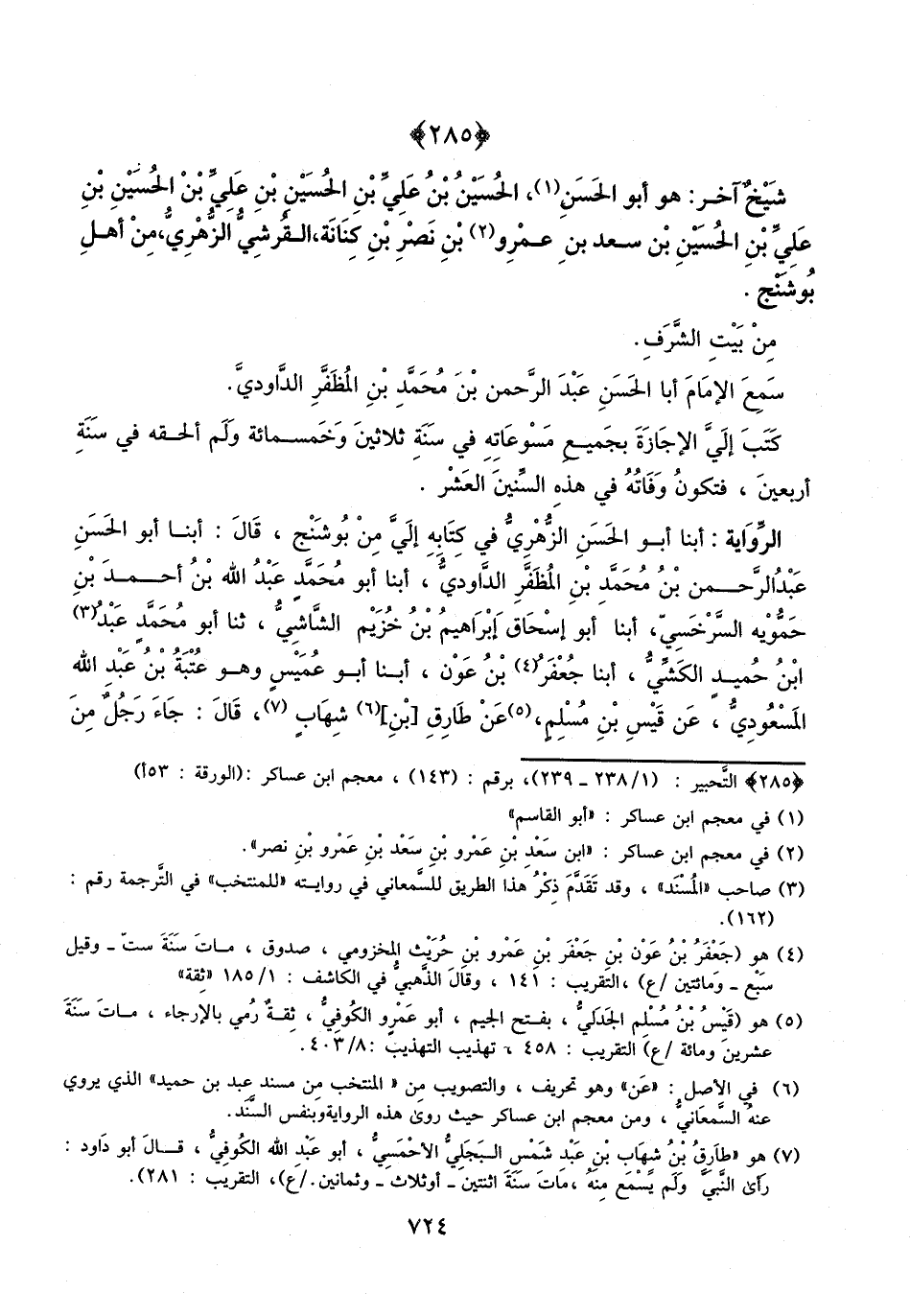 شيخ آخر: هو أبو الحسن الحسين بن علي بن الحسين بن علي بن الحسين بن علي بن الحسين بن سعد بن عمرو بن نصر بن كنانة القرشي الزهري