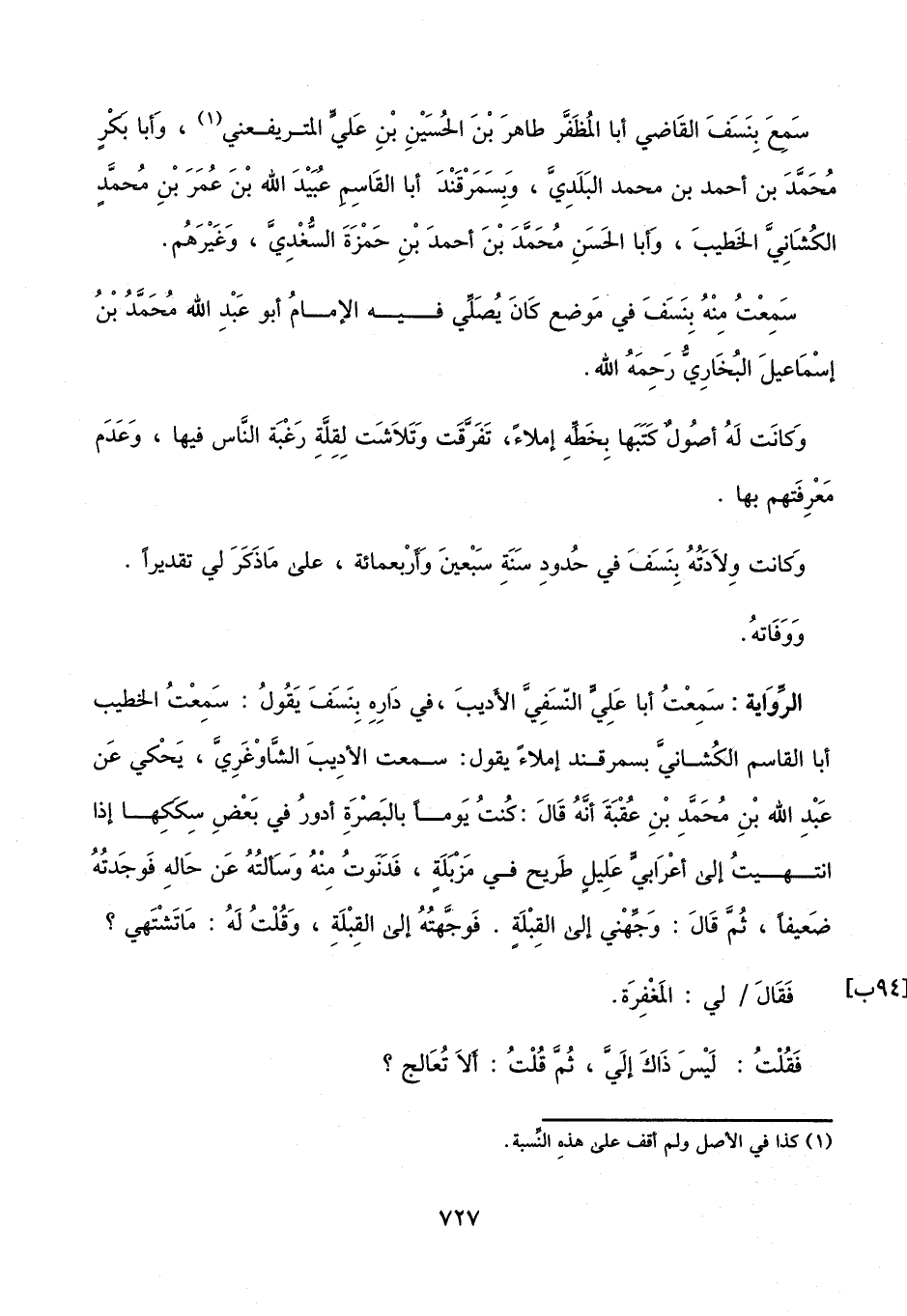 سمعت منه بنسف في موضع كان يصلي فيه الإمام أبو عبد الله محمد بن إسماعيل البخاري، رحمه الله.