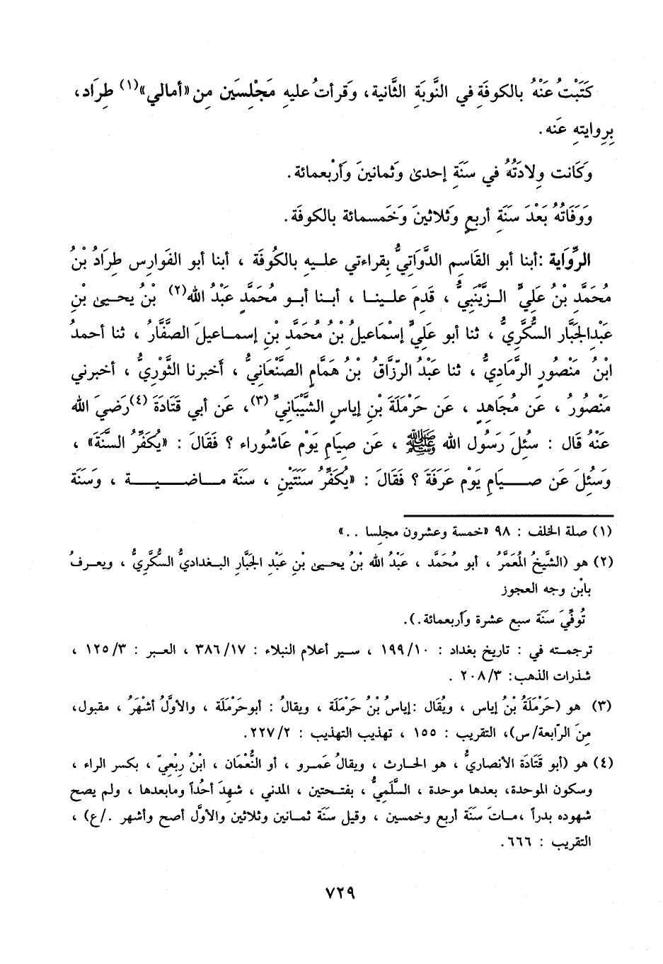 أبنا أَبُو الْقَاسِمِ الدَّوَاتِيُّ، بِقِرَاءَتِي عَلَيْهِ بِالْكُوفَةِ، أبنا أَبُو الْفَوَارِسِ طَرَّادُ بْنُ مُحَمَّدِ بْنِ عَلِيٍّ الزَّيْنَبِيُّ، قَدِمَ عَلَيْنَا، أَبْنَا أَبُو مُحَمَّدٍ عَبْدُ اللَّهِ بْنُ يَحْيَى بْنِ عَبْدِ الْجَبَّارِ السُّكَّرِيُّ، ثنا أَبُو عَلِيٍّ إِسْمَاعِيلُ بْنُ مُحَمَّدِ بْنِ إِسْمَاعِيلَ الصَّفَّارُ، ثنا أَحْمَدُ بْنُ مَنْصُورٍ الرَّمَادِيُّ، ثنا عَبْدُ الرَّزَّاقِ بْنُ هَمَّامٍ الصَّنْعَانِيُّ، أَخْبَرَنَا الثَّوْرِيُّ، أَخْبَرَنِي مَنْصُورٌ، عَنْ مُجَاهِدٍ، عَنْ حَرْمَلَةَ بْنِ إِيَاسٍ الشَّيْبَانِيِّ، عَنْ أَبِي قَتَادَةَ، رَضِيَ اللَّهُ عَنْهُ، قَالَ: سُئِلَ رَسُولُ اللَّهِ، صَلَّى اللَّهُ عَلَيْهِ وَسَلَّمَ، عَنْ صِيَامِ يَوْمِ عَاشُورَاءَ؟ فَقَالَ: «يُكَفِّرُ سَنَةً» ، وَسُئِلَ عَنْ صِيَامِ يَوْمِ عَرَفَةَ؟ فَقَالَ: «يُكَفِّرُ سَنَتَيْنِ، سَنَةً مَاضِيَةً، وَسَنَةً
