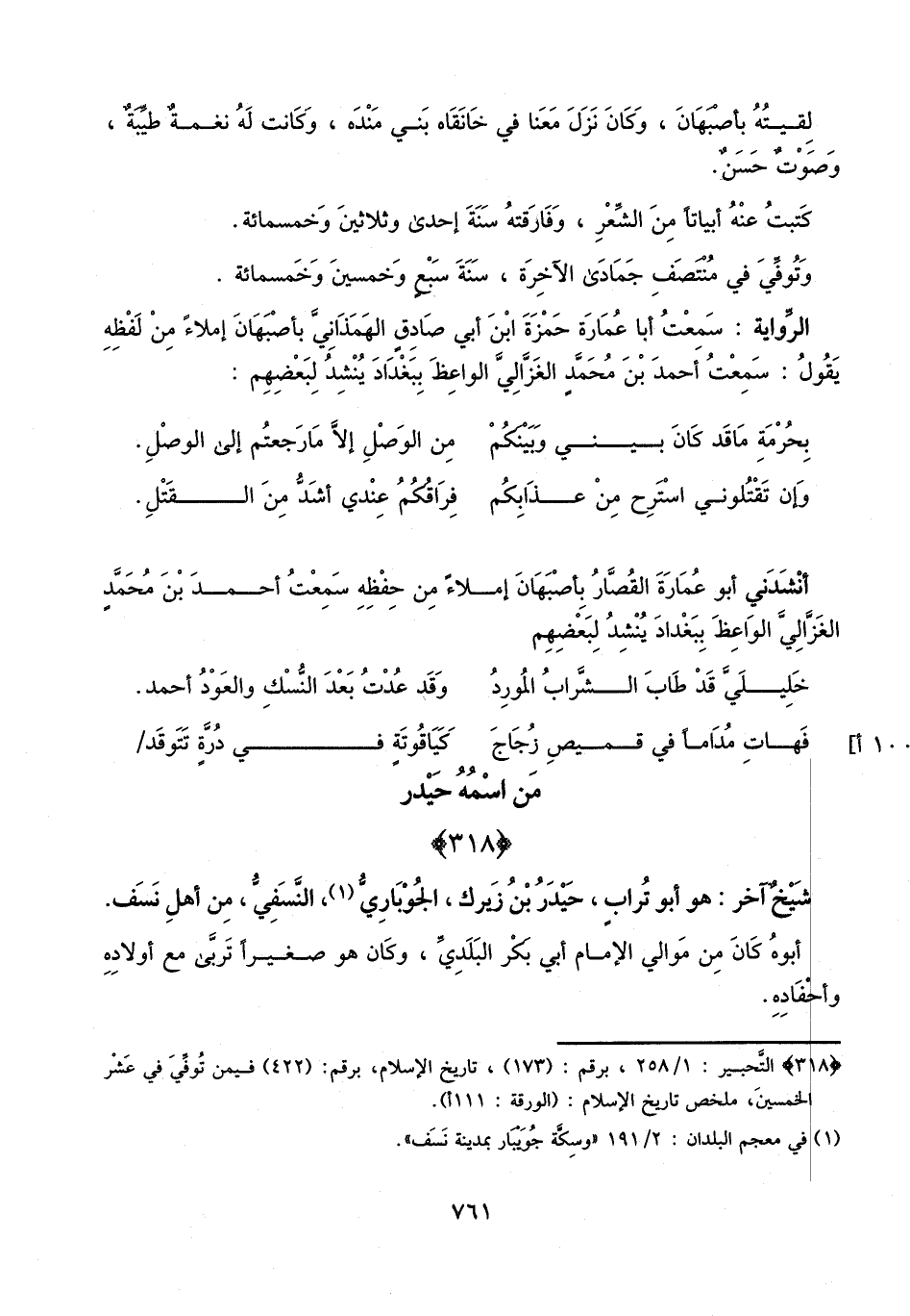 سمعت أبا عمارة حمزة بن أبي صادق الهمذاني، بأصبهان إملاء من لفظه، يقول: سمعت أحمد بن محمد الغزالي الواعظ ببغداد ينشد لبعضهم: بحرمة ما قد كان بيني وبينكم ... من الوصل إلا ما رجعتم إلى الوصل