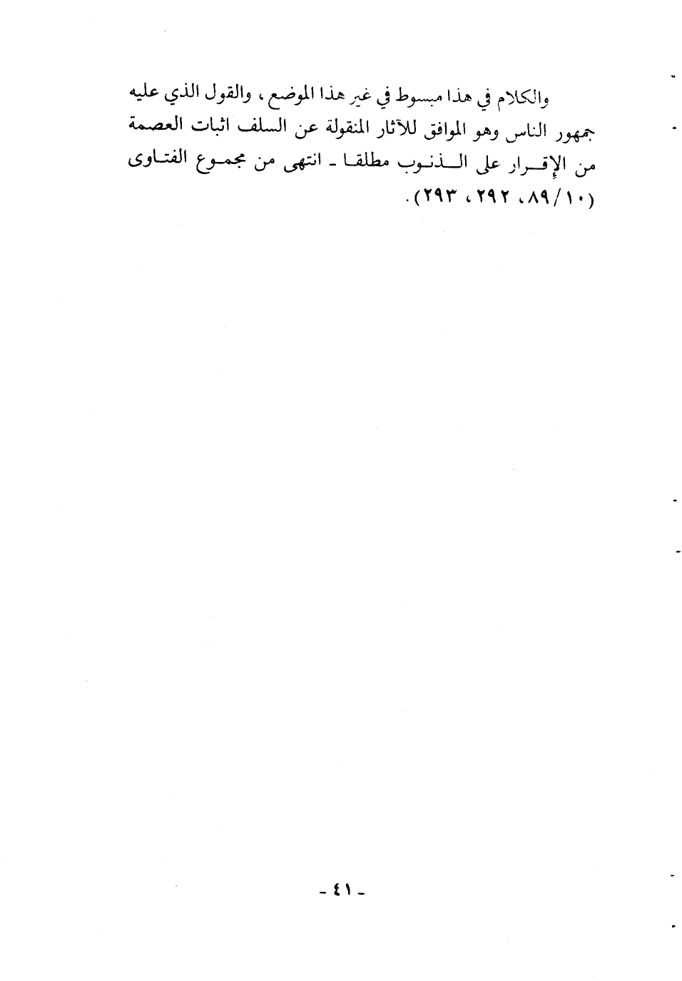 والكلام في هذا مبسوط في غير هذا الموضع، والقول الذي عليه جمهور الناس وهو الموافق للآثار المنقولة عن السلف إثبات العصمة من الإقرار على الذنوب مطلقاً –انتهى من مجموع الفتاوى (10/89، 292، 293) .