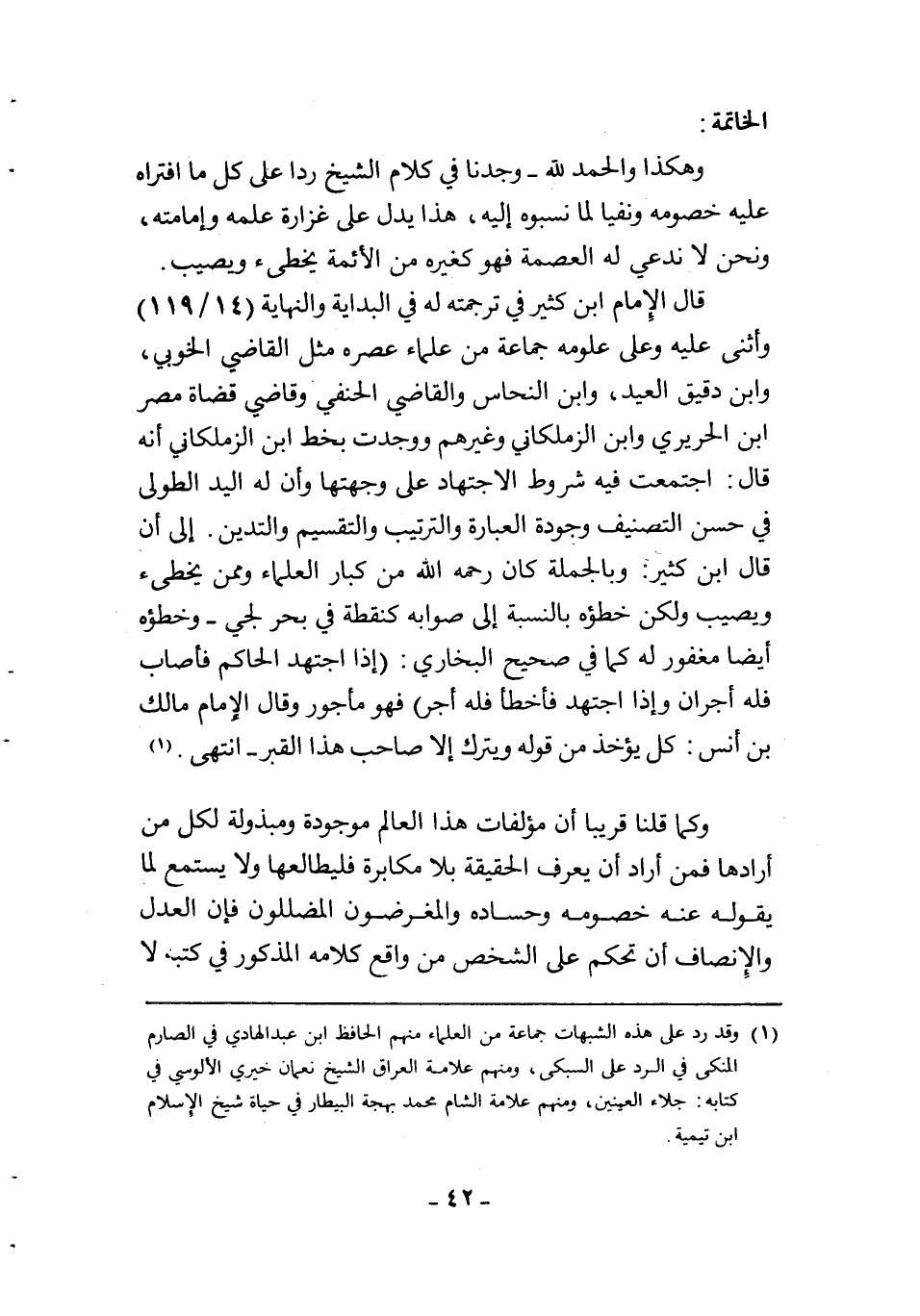 وهكذا والحمد لله –وجدنا في كلام الشيخ رداً على كل ما افتراه عليه خصومه ونفياً لما نسبوه إليه، هذا يدل على غزارة علمه وإمامته، ونحن لا ندعي له العصمة، فهو كغيره من الأئمة يخطئ ويصيب.