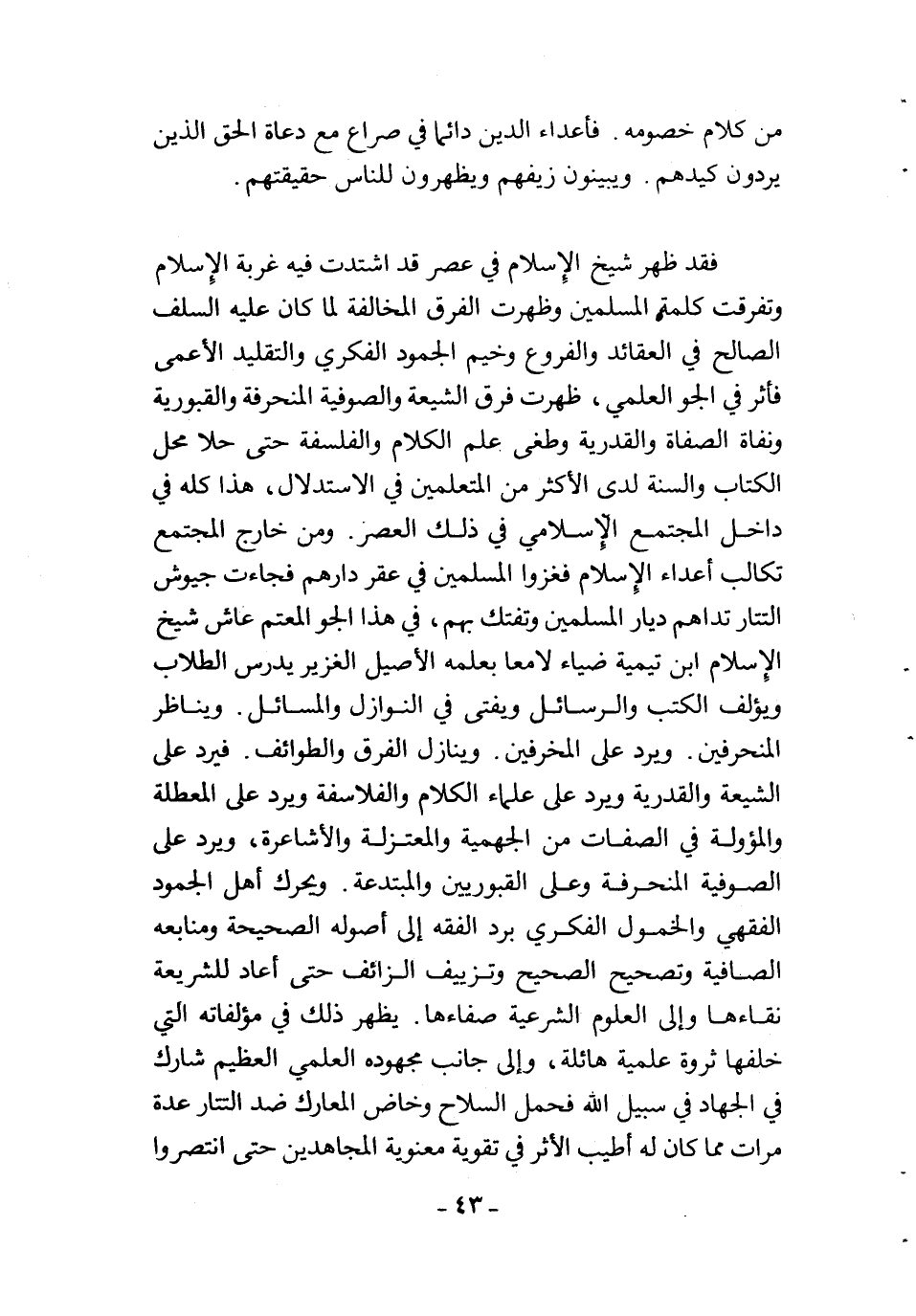 فقد ظهر شيخ الإسلام في عصر قد اشتدت فيه غربة الإسلام وتفرقت كلمة المسلمين، وظهرت الفرق المخالفة لما كان عليه السلف الصالح في العقائد والفروع، وخيم الجمود الفكري والتقليد الأعمى فأثر في الجو العلمي، ظهرت فرق الشيعة والصوفية المنحرفة والقبورية ونفاة الصفاة والقدرية، وطغى علم الكلام والفلسفة حتى حلا محل الكتاب والسنة لدى الأكثر من المتعلمين في الاستدلال، هذا كله في داخل المجتمع الإسلامي في ذلك العصر. ومن خارج المجتمع تكالب أعداء الإسلام فغزوا المسلمين في عقر دارهم فجاءت جيوش التتار تداهم ديار المسلمين وتفتك بهم في هذا الجو المعتم عاش شيخ الإسلام ابن تيمية ضياء لامعاً بعلمه الأصيل الغزير يدرس الطلاب ويؤلف الكتب والرسائل ويفتي في النوازل والمسائل. ويناظر المنحرفين. ويرد على المخرفين. وينازل الفرق والطوائف. فيرد على الشيعة والقدرية ويرد على علماء الكلام والفلاسفة، ويرد على المعطلة والمؤولة في الصفات من الجهمية والمعتزلة والأشاعرة، ويرد على الصوفية المنحرفة وعلى القبوريين والمبتدعة. ويحرك أهل الجمود الفقهي والخمول الفكري برد الفقه إلى أصوله الصحيحة، ومنابعه الصافية، وتصحيح الصحيح وتزييف الزائف حتى أعاد للشريعة نقاءها وإلى العلوم الشرعية صفاءها. يظهر ذلك في مؤلفاته التي خلفها ثروة علمية هائلة، وإلى جانب مجهوده العلمي العظيم شارك في الجهاد في سبيل الله فحمل السلاح وخاض المعارك ضد التتار عدة مرات، مما كان له أطيب الأثر في تقوية معنوية المجاهدين حتى انتصروا