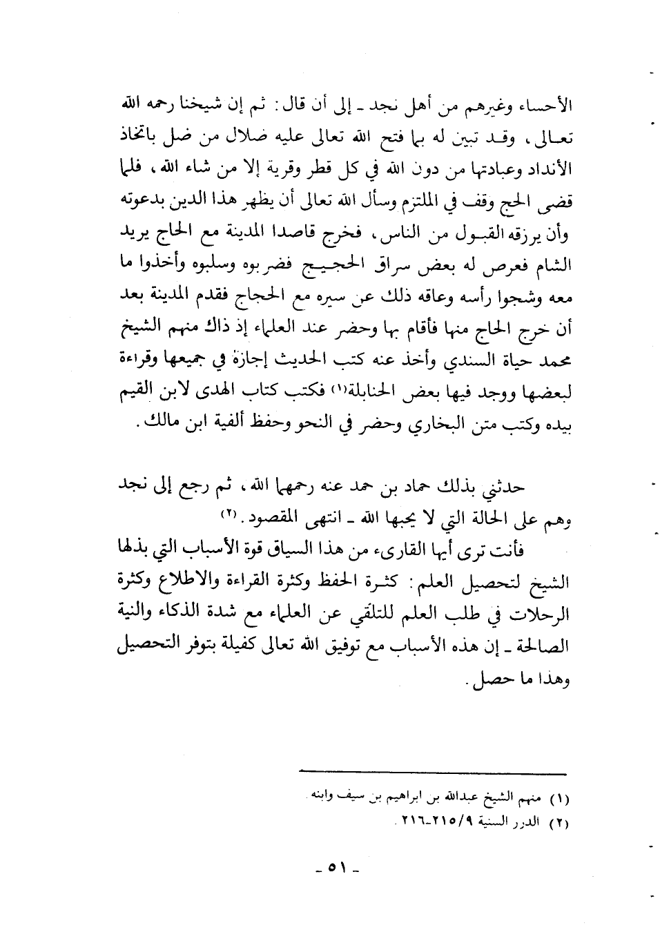 الأحساء وغيرهم من أهل نجد –إلى أن قال: ثم إن شيخنا رحمه الله تعالى، قد تبين له بما فتح الله تعالى عليه ضلال من ضل باتخاذ الأنداد وعبادتها من دون الله في كل قطر وقرية إلا من شاء الله، فلما قضى الحج وقف في الملتزم وسأل الله تعالى أن يظهر هذا الدين بدعوته وأن يرزقه القبول من الناس، فخرج قاصداً المدينة مع الحاج يريد الشام، فعرض له بعض سراق الحجيج فضربوه وسلبوه وأخذوا ما معه وشجوا رأسه وعاقه ذلك عن سيره مع الحجاج، فقدم المدينة بعد أن خرج الحاج منها فأقام بها وحضر عند العلماء إذ ذاك منهم الشيخ محمد حياة السندي وأخذ عنه كتب الحديث إجازة في جميعها، وقراءة لبعضها، ووجد فيها بعض الحنابلة1 فكتب كتاب الهدى لابن القيم بيده وكتب متن البخاري وحضر في النحو وحفظ ألفية ابن مالك.