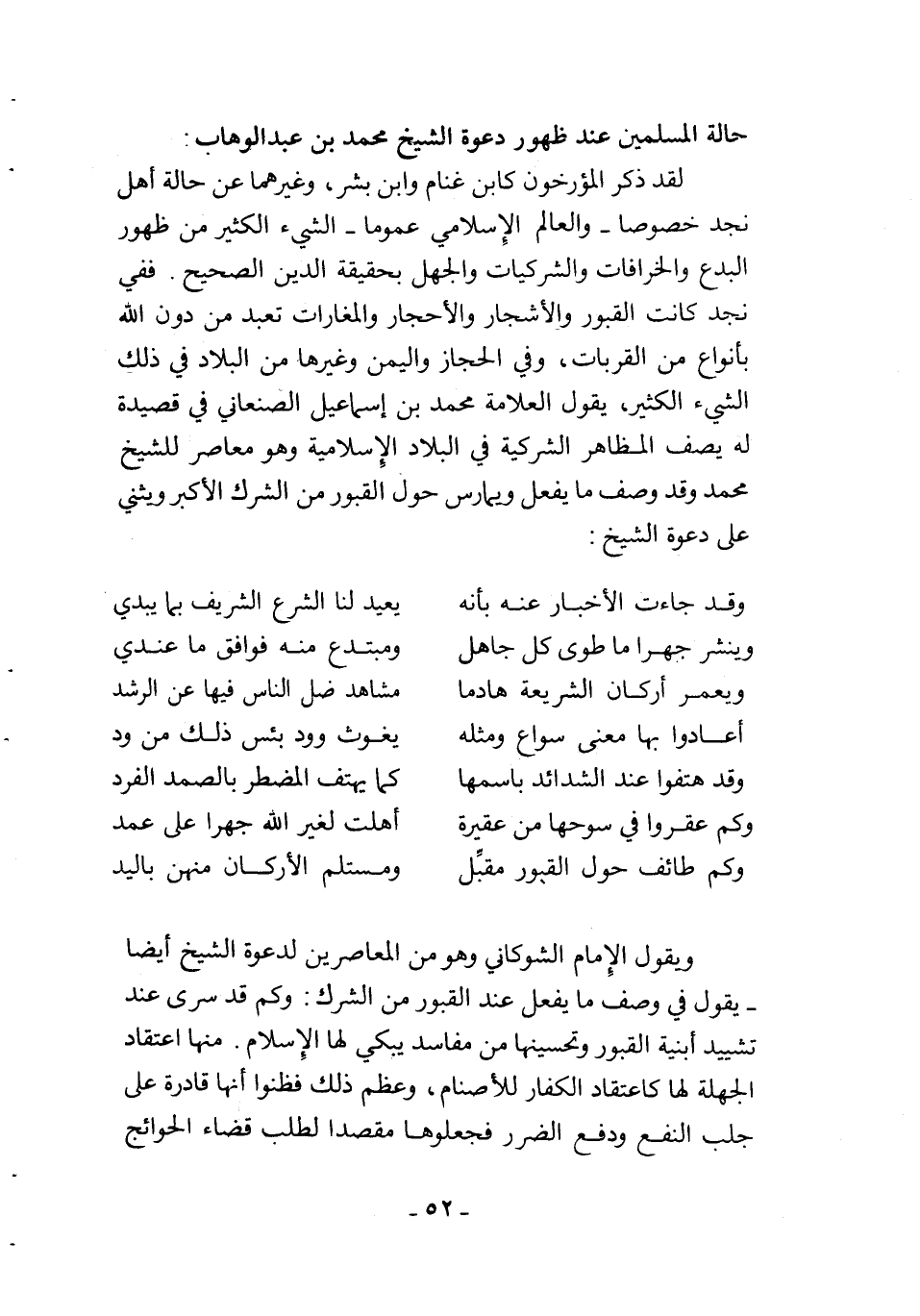 ويقول الإمام الشوكاني وهو من المعاصرين لدعوة الشيخ أيضاً –يقول في وصف ما يفعل عند القبور من الشرك: وكم قد سرى عند تشييد أبنية القبور وتحسينها من مفاسد يبكي لها الإسلام. منها اعتقاد الجهلة لها كاعتقاد الكفار للأصنام، وعظم ذلك فظنوا أنها قادرة على جلب النفع ودفع الضرر، فجعلوها مقصداً لطلب قضاء الحوائج
