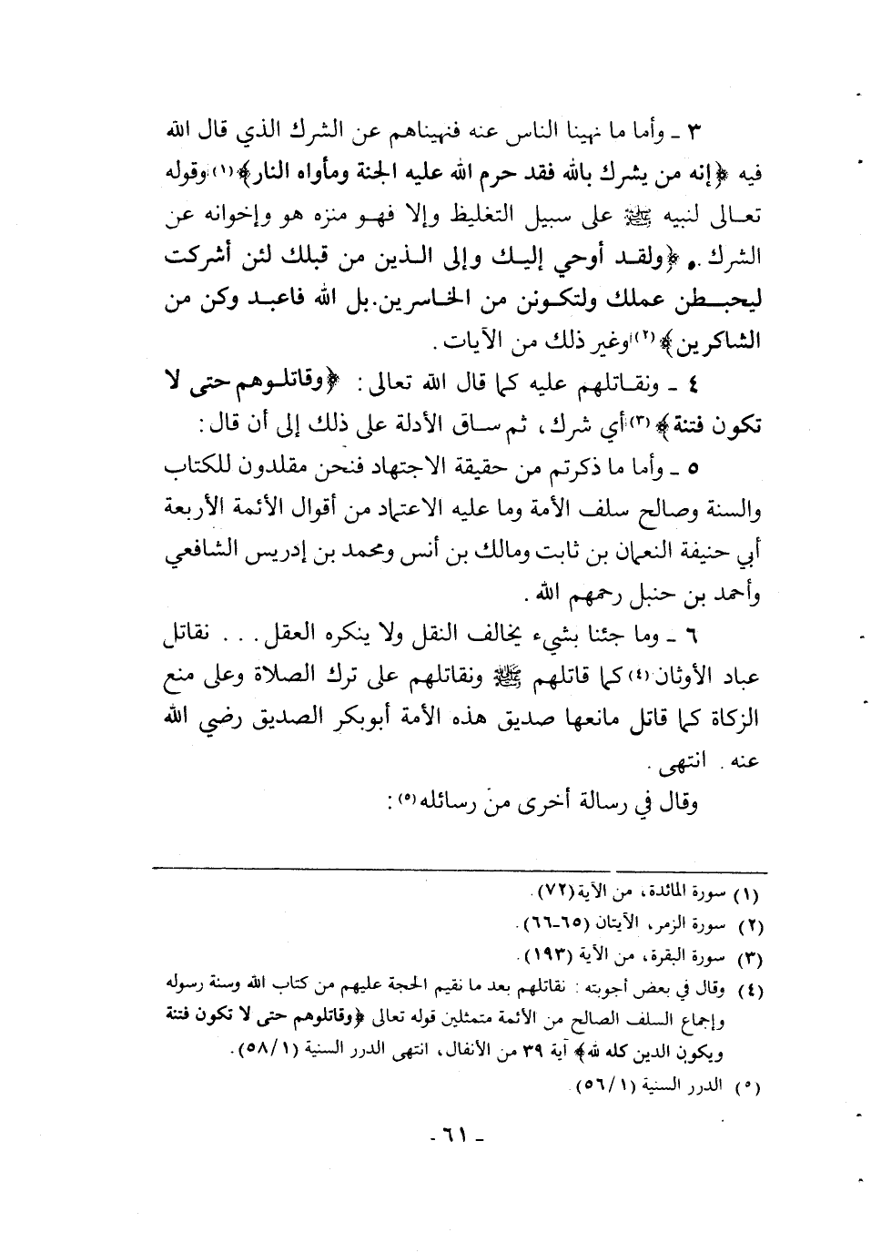 4 وقال في بعض أجوبته: نقاتلهم بعد ما نقيم الحجة عليهم من كتاب الله وسنة رسوله وإجماع السلف الصالح من الأئمة متمثلين قوله تعالى: {وَقَاتِلُوهُمْ حَتَّى لا تَكُونَ فِتْنَةٌ وَيَكُونَ الدِّينُ كُلُّهُ لِلَّهِ} آية: 39 من الأنفال، انتهى الدرر السنية 1/58.