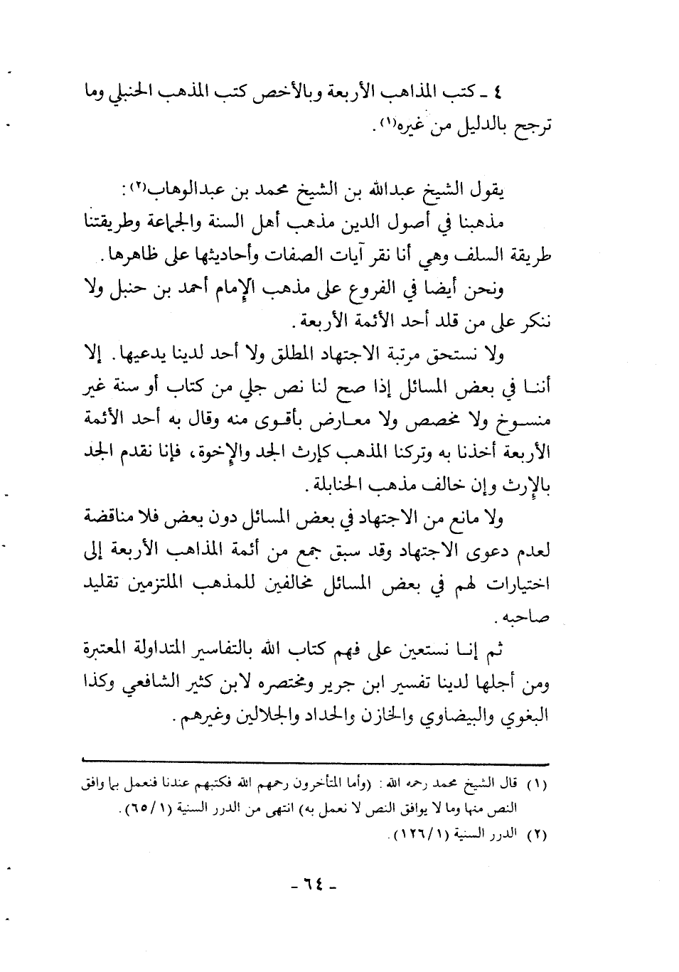 ولا نستحق مرتبة الاجتهاد المطلق ولا أحد لدينا يدعيها. إلا أننا في بعض المسائل إذا صح لنا نص جلي من كتاب أو سنة غير منسوخ ولا مخصص ولا معارض بأقوى منه، وقال به أحد الأئمة الأربعة أخذنا به وتركنا المذهب كإرث الجد والإخوة، فإنا نقدم الجد بالإرث وإن خالف مذهب الحنابلة.