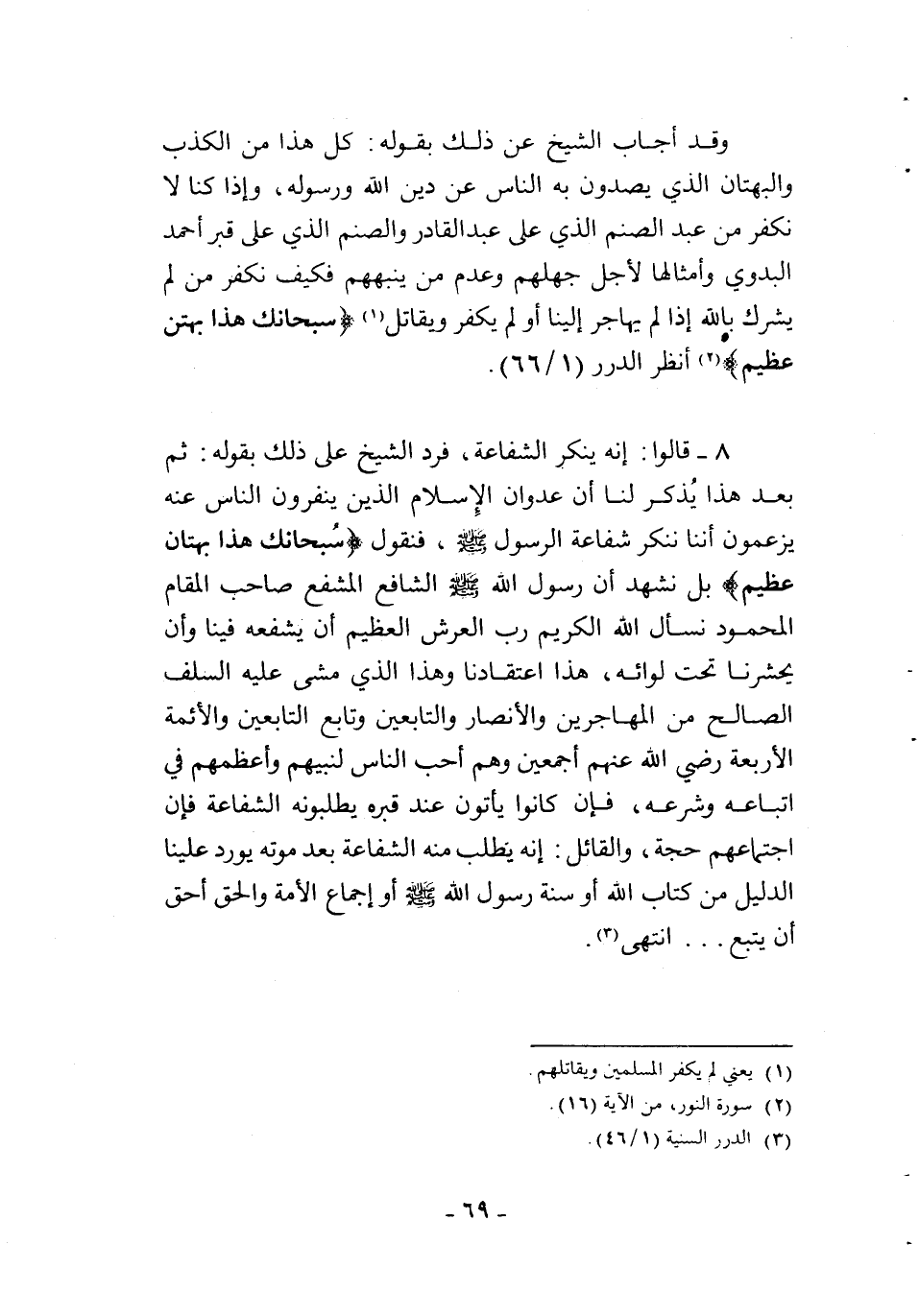 وقد أجاب الشيخ عن ذلك بقوله: كل هذا من الكذب والبهتان الذي يصدون بها الناس عن دين الله ورسوله، وإذا كنا لا نكفر من عبد الصنم الذي على عبد القادر، والصنم الذي على قبر أحمد البدوي وأمثالها لأجل جهلهم وعدم من ينبههم، فكيف نكفر من لم يشرك بالله إذا لم يهاجر إلينا أو لم يكفر ويقاتل1 {سُبْحَانَكَ هَذَا بُهْتَانٌ عَظِيمٌ} 2 انظر الدرر (1/66) .