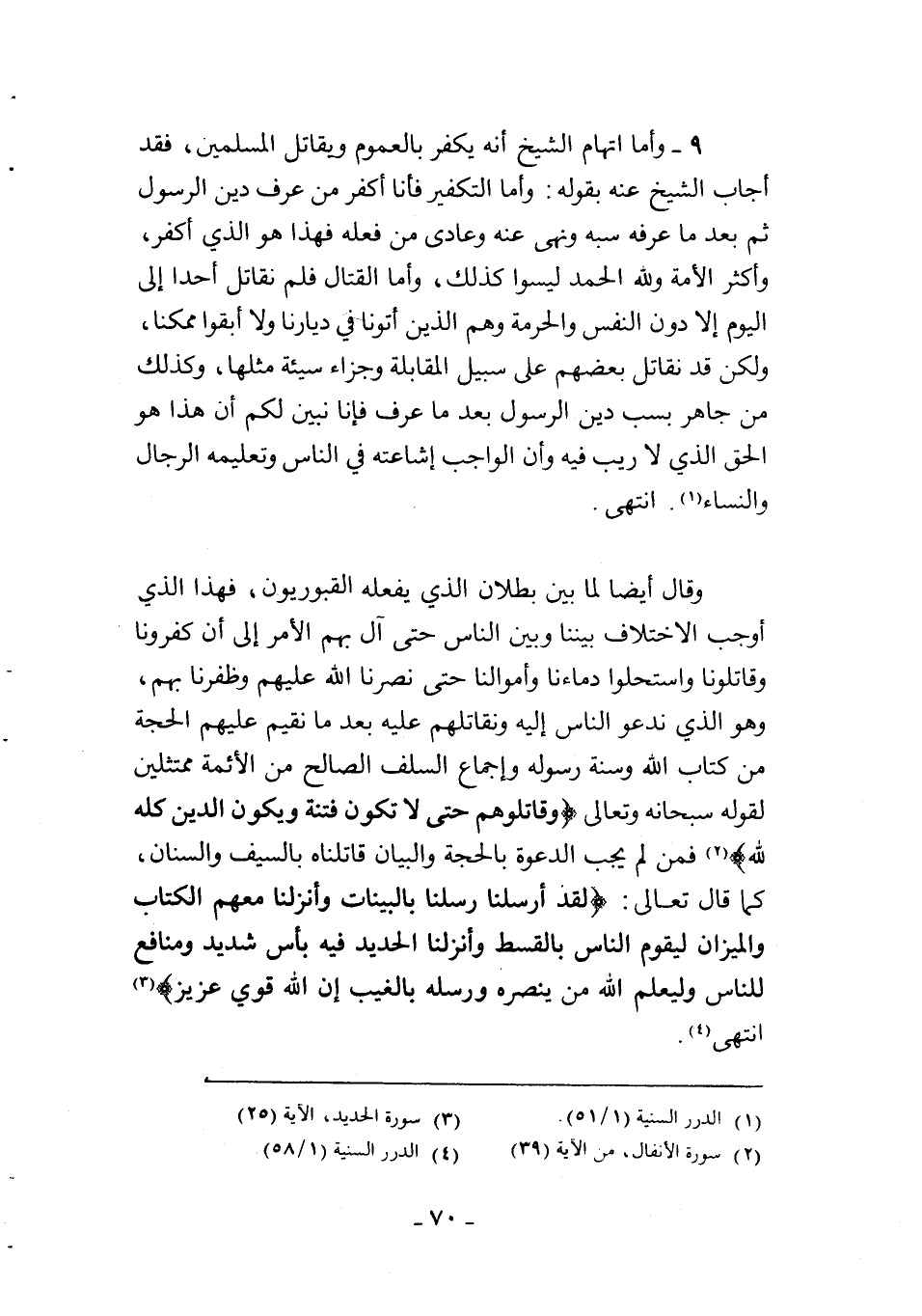 وقال أيضاً لما بين بطلان الذي يفعله القبوريون، فهذا الذي أوجب الاختلاف بيننا وبين الناس، حتى آل بهم الأمر إلى أن كفرونا وقاتلونا واستحلوا دماءنا وأموالنا حتى نصرنا الله عليهم وظفرنا بهم، وهو الذي ندعو الناس إليه ونقاتلهم عليه بعد ما نقيم عليهم الحجة من كتاب الله وسنة رسوله وإجماع السلف الصالح من الأئمة ممتثلين لقوله سبحانه وتعالى: {وَقَاتِلُوهُمْ حَتَّى لا تَكُونَ فِتْنَةٌ وَيَكُونَ الدِّينُ كُلّهُ لِلَّهِ} 2، فمن لم يجب الدعوة بالحجة والبيان قاتلنا بالسيف والسنان، كما قال تعالى: {لَقَدْ أَرْسَلْنَا رُسُلَنَا بِالْبَيِّنَاتِ وَأَنْزَلْنَا مَعَهُمُ الْكِتَابَ وَالْمِيزَانَ لِيَقُومَ النَّاسُ بِالْقِسْطِ وَأَنْزَلْنَا الْحَدِيدَ فِيهِ بَأْسٌ شَدِيدٌ وَمَنَافِعُ لِلنَّاسِ وَلِيَعْلَمَ اللَّهُ مَنْ يَنْصُرُهُ وَرُسُلَهُ بِالْغَيْبِ إِنَّ اللَّهَ قَوِيٌّ عَزِيزٌ} 3 انتهى4.
