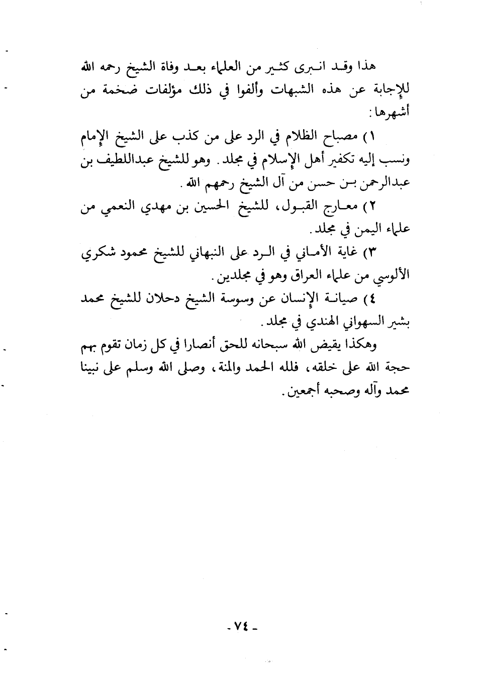 1) مصباح الظلام في الرد على من كذب على الشيخ الإمام، ونسب إليه تكفير أهل الإسلام في مجلد. وهو للشيخ عبد اللطيف بن عبد الرحمن بن حسن من آل الشيخ رحمهم الله.