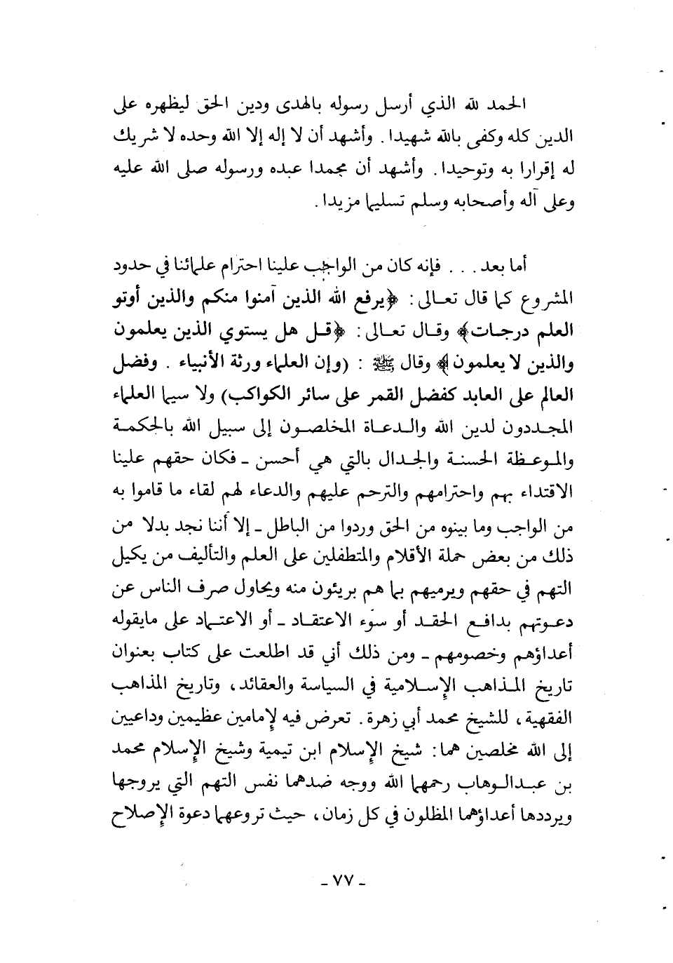 أما بعد ... فإنه كان من الواجب علينا احترام علمائنا في حدود المشروع كما قال تعالى: {يَرْفَعِ اللَّهُ الَّذِينَ آمَنُوا مِنْكُمْ وَالَّذِينَ أُوتُوا الْعِلْمَ دَرَجَاتٍ} وقال تعالى: {قُلْ هَلْ يَسْتَوِي الَّذِينَ يَعْلَمُونَ وَالَّذِينَ لا يَعْلَمُونَ} . وقال صلى الله عليه وسلم: "وإن العلماء ورثة الأنبياء. وفضل العالم على العابد كفضل القمر على سائر الكواكب "، ولا سيما العلماء المجددون لدين الله والدعاة المخلصون إلى سبيل الله بالحكمة والموعظة الحسنة والجدال بالتي هي أحسن –فكان حقهم علينا الاقتداء بهم واحترامهم والترحم عليهم، والدعاء لهم لقاء ما قاموا به من الواجب وما بينوه من الحق وردوا من الباطل- إلا أننا نجد بدلاً من ذلك من بعض حملة الأقلام والمتطفلين على العلم والتأليف من يكيل التهم في حقهم ويرميهم بما هم بريئون منه ويحاول صرف الناس عن دعوتهم بدافع الحقد أو سوء الاعتقاد –أو الاعتماد على ما يقوله أعداؤهم وخصومهم- ومن ذلك أني قد اطلعت على كتاب بعنوان تاريخ المذاهب الإسلامية في السياسة والعقائد، وتاريخ المذاهب الفقهية، للشيخ محمد أبي زهرة، تعرض فيه لإمامين عظيمين وداعيين إلى الله مخلصين هما: شيخ الإسلام ابن تيمية وشيخ الإسلام محمد بن عبد الوهاب رحمهما الله، ووجه ضدهما نفس التهم التي يروجها ويرددها أعداؤهما المظلون في كل زمان، حيث تروعهما دعوة الإصلاح