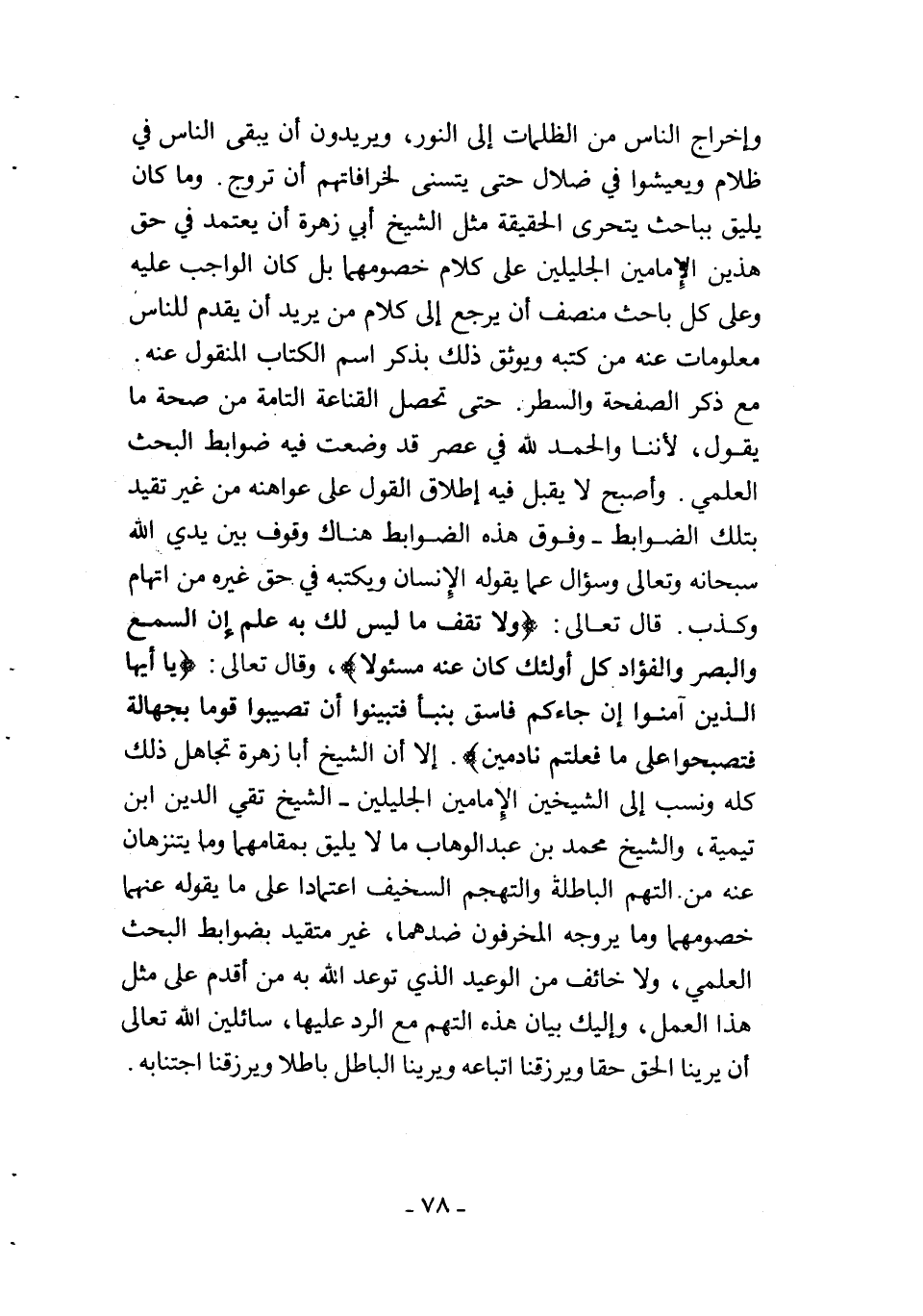 وإخراج الناس من الظلمات إلى النور، ويريدون أن يبقى الناس في ظلام ويعيشوا في ضلال حتى يتسنى لخرافاتهم أن تروج، وما كان يليق بباحث يتحرى الحقيقة مثل الشيخ أبي زهرة أن يعتمد في حق هذين الإمامين الجليلين على كلام خصومهما بل كان الواجب عليه وعلى كل باحث منصف أن يرجع إلى من يريد أن يقدم للناس معلومات عنه من كتبه ويوثق ذلك بذكر اسم الكتاب المنقول عنه. مع ذكر الصفحة السطر. حتى تحصل القناعة التامة من صحة ما يقول، لأننا والحمد لله في عصر قد وضعت فيه ضوابط البحث العلمي. وأصبح لا يقبل فيه إطلاق القول على عواهنه من غير تقيد بتلك الضوابط –وفوق هذه الضوابط هناك وقوف بين يدي الله سبحانه وتعالى وسؤال عما يقوله الإنسان ويكتبه في حق غيره من اتهام وكذب. قال تعالى: {وَلا تَقْفُ مَا لَيْسَ لَكَ بِهِ عِلْمٌ إِنَّ السَّمْعَ وَالْبَصَرَ وَالْفُؤَادَ كُلُّ أُولَئِكَ كَانَ عَنْهُ مَسْؤُولاً} ، وقال تعالى: {يَا أَيُّهَا الَّذِينَ آمَنُوا إِنْ جَاءَكُمْ فَاسِقٌ بِنَبَأٍ فَتَبَيَّنُوا أَنْ تُصِيبُوا قَوْماً بِجَهَالَةٍ فَتُصْبِحُوا عَلَى مَا فَعَلْتُمْ نَادِمِينَ} . إلا أن الشيخ أبا زهرة تجاهل ذلك كله، ونسب إلى الشيخين الإمامين الجليلين –الشيخ تقي الدين ابن تيمية، والشيخ محمد بن عبد الوهاب ما لا يليق بمقامهما وما يتنزهان عنه من التهم الباطلة والتهجم السخيف اعتماداً على ما يقوله عنهما خصومهما وما يروجه المخرفون ضدهما، غير متقيد بضوابط البحث العلمي، ولا خائف من الوعيد الذي توعد الله به من أقدم على مثل هذا العمل، وإليك بيان هذه التهم مع الرد عليها، سائلين الله تعالى أن يرينا الحق حقاً ويرزقنا اتباعه ويرينا الباطل باطلاً ويرزقنا اجتنابه.