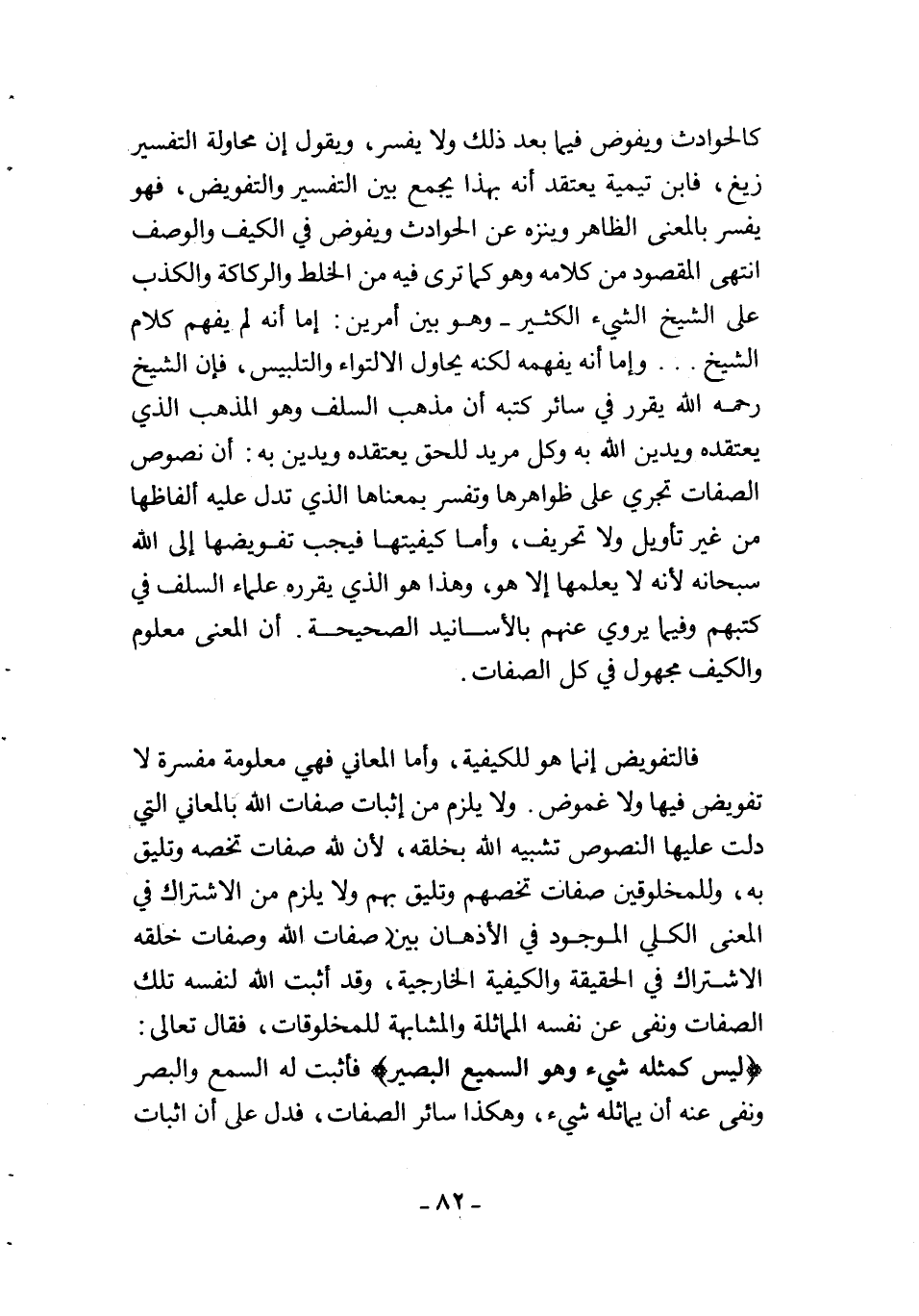 كالحوادث ويفوض فيما بعد ذلك ولا يفسر، ويقول إن محاولة التفسير زيغ، فابن تيمية يعتقد أنه بهذا يجمع بين التفسير والتفويض، فهو يفسر بالمعنى الظاهر وينزه عن الحوادث ويفوض في الكيف والوصف، انتهى المقصود من كلامه وهو كما ترى فيه من الخلط والركاكة والكذب على الشيخ الشيء الكثير –وهو بين أمرين: إما أنه لم يفهم كلام الشيخ ... وإما أنه يفهمه لكنه يحاول الالتواء والتلبيس، فإن الشيخ رحمه الله يقرر في سائر كتبه أن مذهب السلف وهو المذهب الذي يعتقده ويدين الله به، وكل مريد للحق يعتقده ويدين به: أن نصوص الصفات تجري على ظواهرها وتفسر بمعناها الذي تدل عليها ألفاظها من غير تأويل ولا تحريف، وأما كيفيتها فيجب تفويضها إلى الله سبحانه لأنه لا يعلمها إلا هو، وهذا هو الذي يقرره علماء السلف في كتبهم، وفيما يروي عنهم بالأسانيد الصحيحة، أن المعنى معلوم والكيف مجهول في كل الصفات.