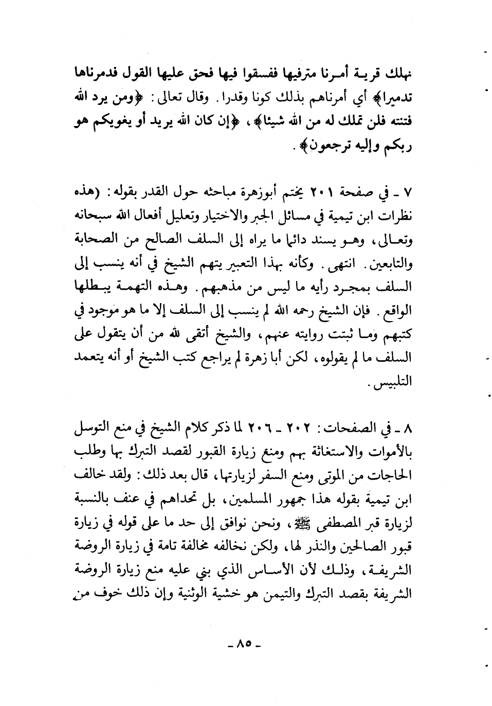 7- في صفحة 201 يختم أبو زهرة مباحثه حول القدر بقوله: (هذه نظرات ابن تيمية في مسائل الجبر والاختيار وتعليل أفعال الله سبحانه وتعالى، وهو يسند دائماً ما يراه إلى السلف الصالح من الصحابة والتابعين. انتهى. وكأنه بهذا التعبير يتهم الشيخ في أنه ينسب إلى السلف بمجرد رأيه ما ليس من مذهبهم، وهذه التهمة يبطلها الواقع. فإن الشيخ رحمه الله لم ينسب إلى السلف إلا ما هو موجود في كتبهم وما ثبتت روايته عنهم، والشيخ أتقى لله من أن يتقول على السلف ما لم يقولوه، لكن أبا زهرة لم يراجع كتب الشيخ أو أنه يتعمد التلبيس.