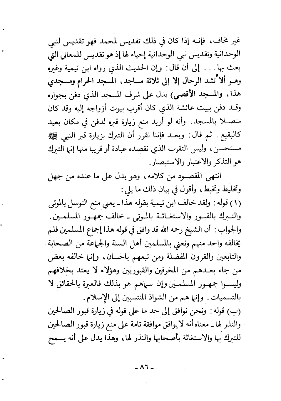 (1) قوله: ولقد خالف ابن تيمية بقوله هذا –يعني منع التوسل بالموتى والتبرك بالقبور والاستغاثة بالموتى- خالف جمهور المسلمين.