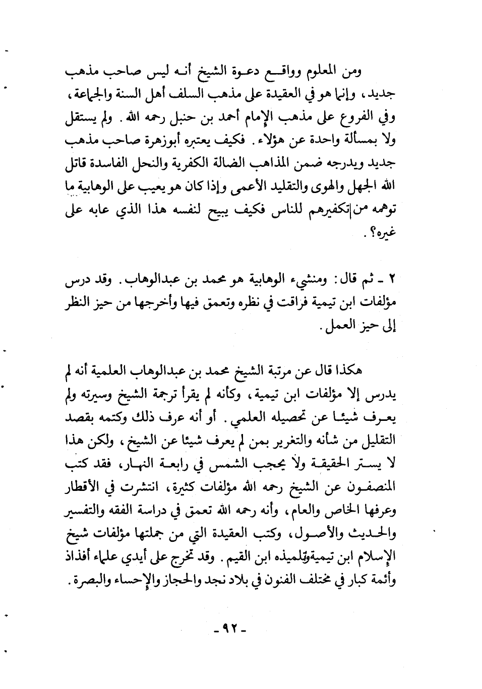 ومن المعلوم وواقع دعوة الشيخ أنه ليس صاحب مذهب جديد، وإنما هو في العقيدة على مذهب السلف أهل السنة والجماعة، وفي الفروع على مذهب الإمام أحمد بن حنبل رحمه الله، ولم يستقل ولا بمسألة واحدة عن هؤلاء. فكيف يعتبره أبو زهرة صاحب مذهب جديد ويدرجه ضمن المذاهب الضالة الكفرية والنحل الفاسدة قاتل الله الجهل والهوى والتقليد الأعمى وإذا كان هو يعيب على الوهابية ما توهمه من تكفيرهم للناس فكيف يبيح لنفسه هذا الذي عابه على غيره؟