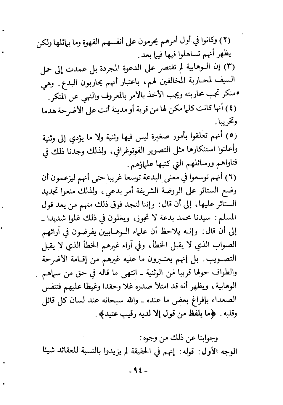 (6) أنهم توسعوا في معنى البدعة توسعاً غريباً حتى أنهم ليزعمون أن وضع الستائر على الروضة الشريفة أمر بدعي، ولذلك منعوا تجديد الستائر عليها، إلى أن قال: وإننا لنجد فوق ذلك منهم من يعد قول المسلم: سيدنا محمد بدعة لا تجوز، ويغلون في ذلك غلواً شديداً- إلى أن قال: وإنه يلاحظ أن علماء الوهابيين يفرضون في آرائهم الصواب الذي لا يقبل الخطأ، وفي آراء غيرهم الخطأ الذي لا يقبل التصويب. بل إنهم يعتبرون ما عليه غيرهم من إقامة الأضرحة والطواف حولها قريباً من الوثنية –انتهى ما قاله في حق من سماهم الوهابية، ويظهر أنه قد امتلأ صدره غلا وحقداً وغيظاً عليهم فتنفس الصعداء بإفراغ بعض ما عنده –والله سبحانه عند لسان كل قائل وقلبه. {مَا يَلْفِظُ مِنْ قَوْلٍ إِلَّا لَدَيْهِ رَقِيبٌ عَتِيدٌ} .