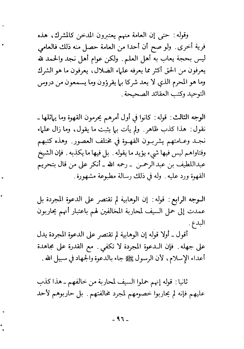 الوجه الثالث: قوله: كانوا في أول أمرهم يحرمون القهوة وما يماثلها –نقول: هذا كذب ظاهر. ولم يأت بما يثبت ما يقول، وما زال علماء نجد وعامتهم يشربون القهوة في مختلف العصور. وهذه كتبهم وفتاواهم ليس فيها شيء يؤيد ما يقوله. بل فيها ما يكذبه. فإن الشيخ عبد اللطيف بن عبد الرحمن رحمه الله أنكر على من قال بتحريم القهوة ورد عليه. وله في ذلك رسالة مطبوعة مشهورة.