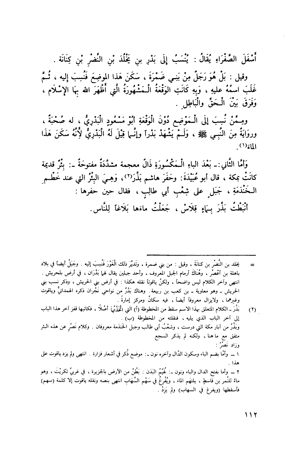 وأما الثَّاني: - بعد الباء المَكْسُورَة ذال معجمة مُشَدَّدَة مَفْتُوحةٌ -: بئرٌ قديمة كانت بمَكَّة، قال أَبُو عبيدة: وحفر هاشم بذر، وهي البِئر التي عند خطمالخندمة، جبل على شِعْبِ أبي طالب، فقال حين حفرها: