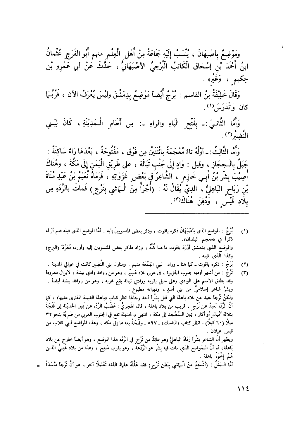 وأما الثَّالِثُ: - أوله تاء معجمة باثنتين من فوق، مَفْتُوحةٌ، بَعْدَهَا راءٌ سَاكِنَة: جبلٌ بالحجاز، وقيل: وادٍ إلى جنب تبالة، على طريق الْيَمَن إلى مَكَّة، وهُناك أصيب بشر بن أبي خازم، الشاعرُ في بعض غزواته، فرماه نُعيم بن عبد مناة بن رياح الباهلي، الذي يُقَالُ له: (أجرأُ من الماشي بترج) فمات بالرده من بلاد قيسٍ، ودُفن هُناك.