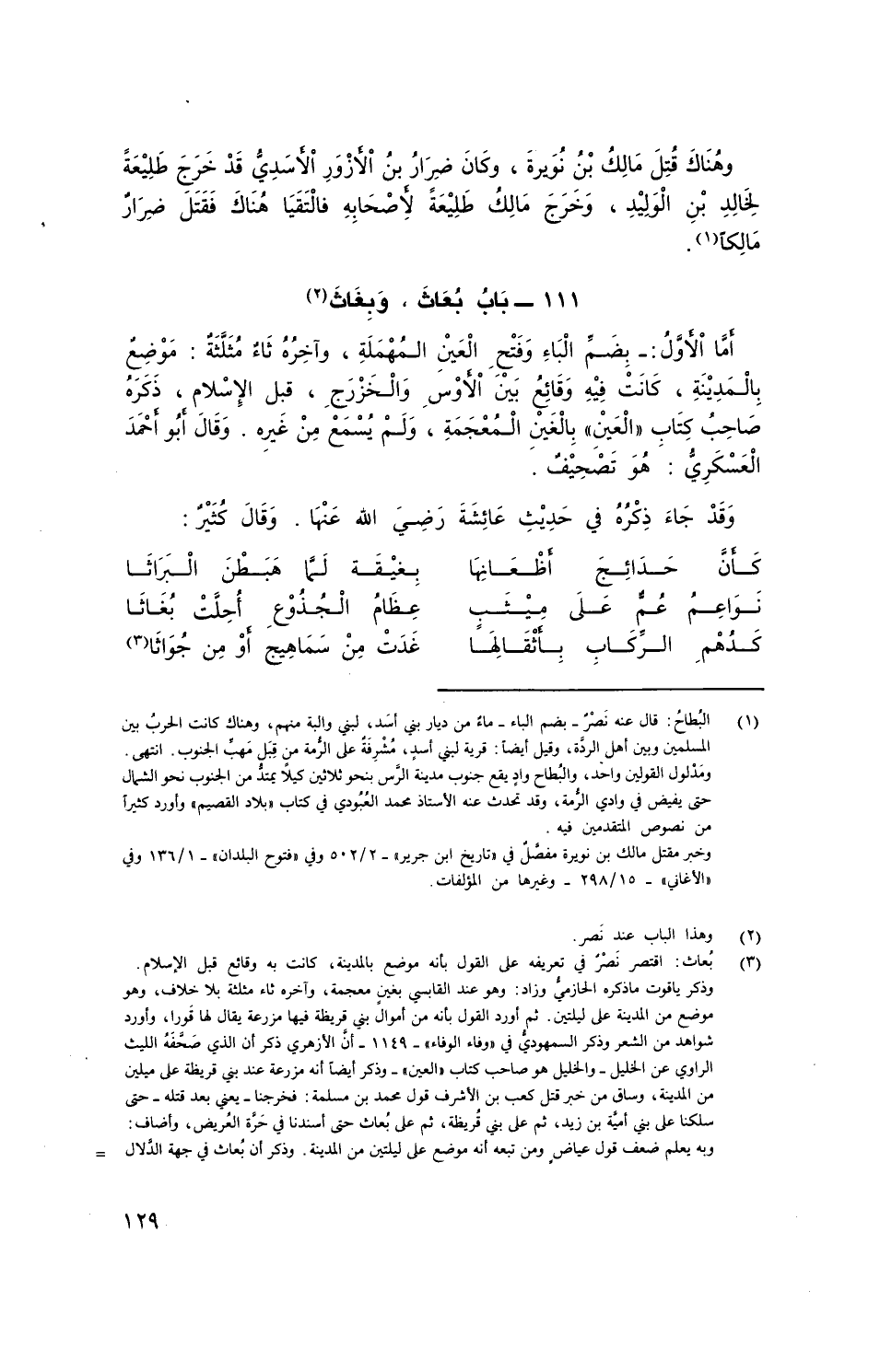 أما اْلأَوَّلُ: - بِضَمِّ الباء وفتح العين المُهْمَلَة، وآخره مثلثة: مَوْضِعٌ بالمدينة، كانت فيه وقائع بين الأوس والخزرج، قبل الإسلام، ذكره صاحبُ كتاب (العين) بالغين المُعْجَمَة، ولم يُسمع من غيره. وقال أَبُو أحمد العسكري: هو تصحيف.