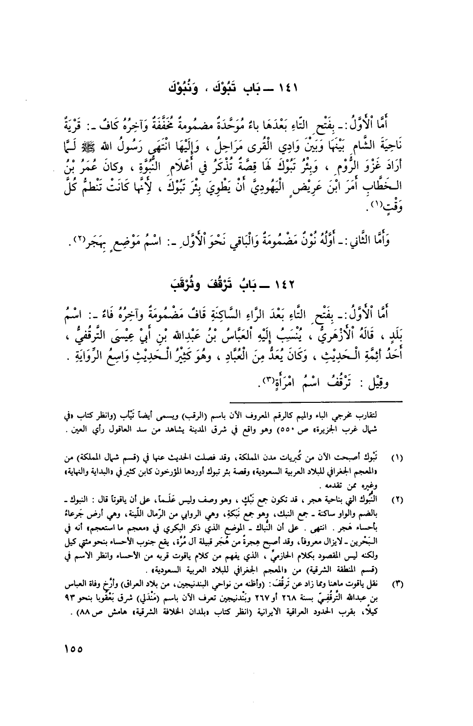 أما اْلأَوَّلُ: - بِفَتْحِ التاء بَعْدَهَا باءٌ مُوْحَّدَة مَضْمُومَة مُخَفَّفَة وآخره كافٌ -: قَرْيَة ناحية الشام بينها وبين وادي القُرى مراحِلُ، وإليها انتهى رَسُوْل الله صَلَّى اللهُ عَلَيْهِ وَسَلَّمَ لما أراد غزْوَ الروم، وبئر تبوك لها قصة تُذكر في أعلام النبوة، وكان عُمَر بن الخطَّاب أمر ابن عريضٍ اليهودي أن يطوي بِئر تبوك، لأنها كانت تنظم كُل وقتٍ.
