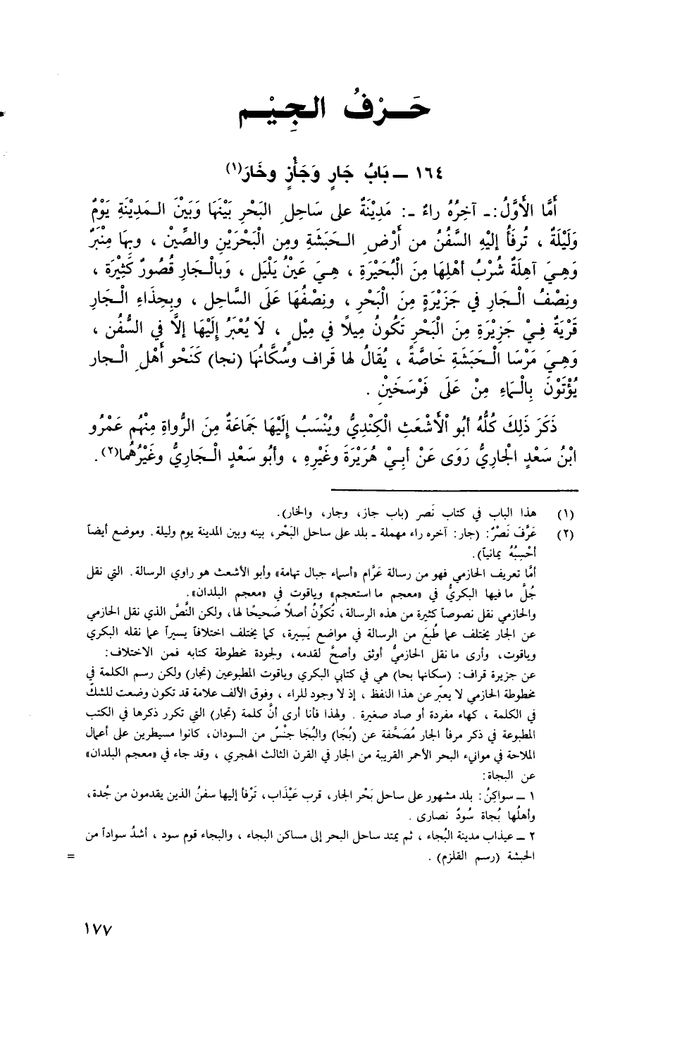 أما اْلأَوَّلُ: - آخره راءٌ -: مدينة على ساحل البحر بينها وبين المدينة يومٌ وليلةٌ، تُرفأ إِلَيْهِ السفن من أرض الحبشة ومن الْبَحْرَيْن والصين، وبها منبرٌ وهي آهلة شُرب أهلها من البحيرة، هي عينُ يليل، وبالجار قُصور كثيرة، ونصف الجار في جزيرة من البحر، ونصفها على الساحل، وبحذاء الجار قَرْيَة في جزيرة من البحر تكون مِيلاً في ميل، لا يُعبر إليها إلا في السفُن، وهي مرسا الحبشة خاصة، يُقَالُ لها قراف وسُكانها (نجا) كنحو أهل الجار يُؤتون بالماء من على فرسخين.