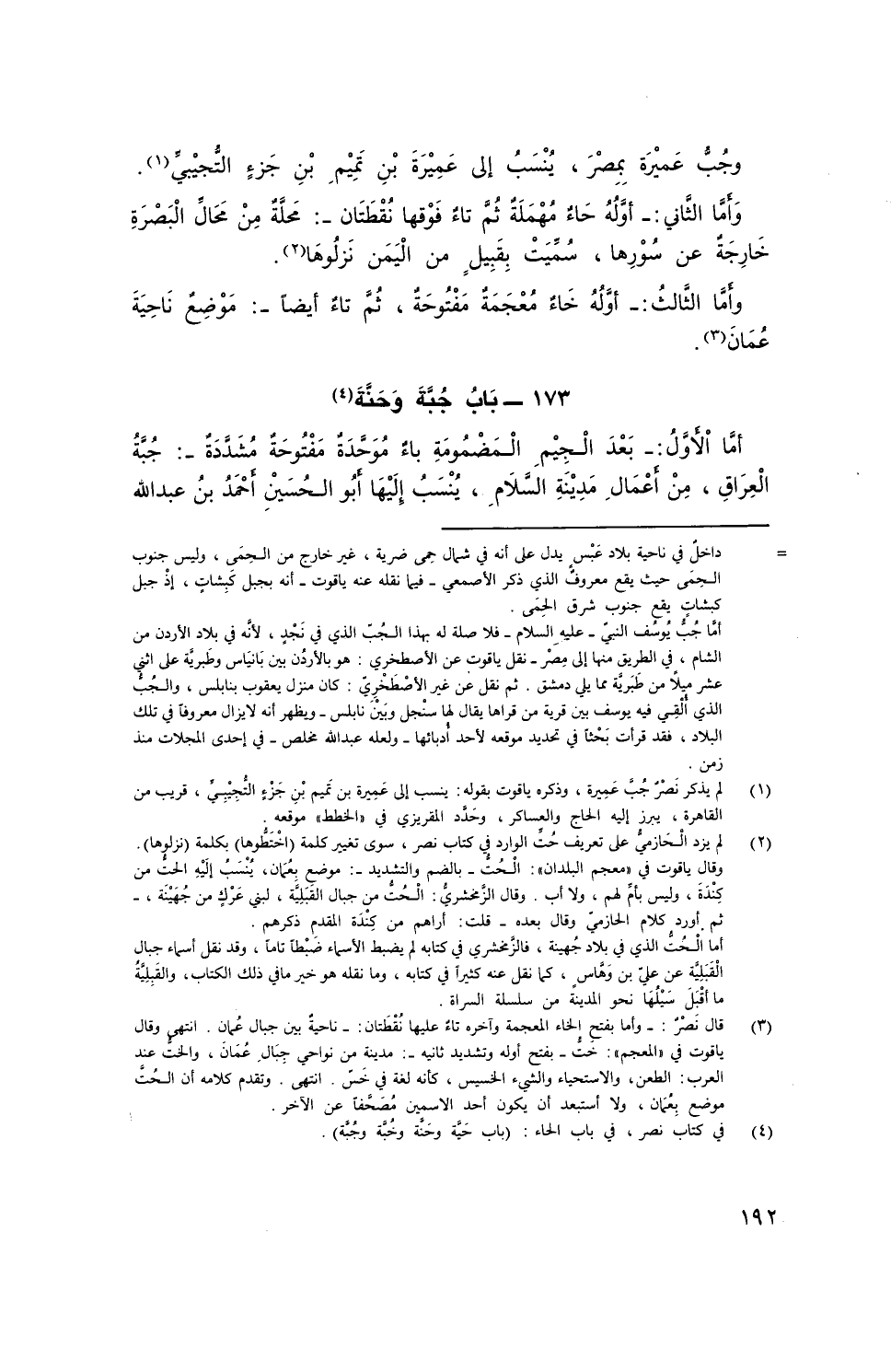 وأما الثَّاني: - أوله حاءٌ مُهْمَلَة ثُمَّ تاءٌ فوقها نُقْطَتَان -: محلة من محال الْبَصْرَة خارجة عن سورها، سُميت بقبيلٍ من الْيَمَن نزلوها.