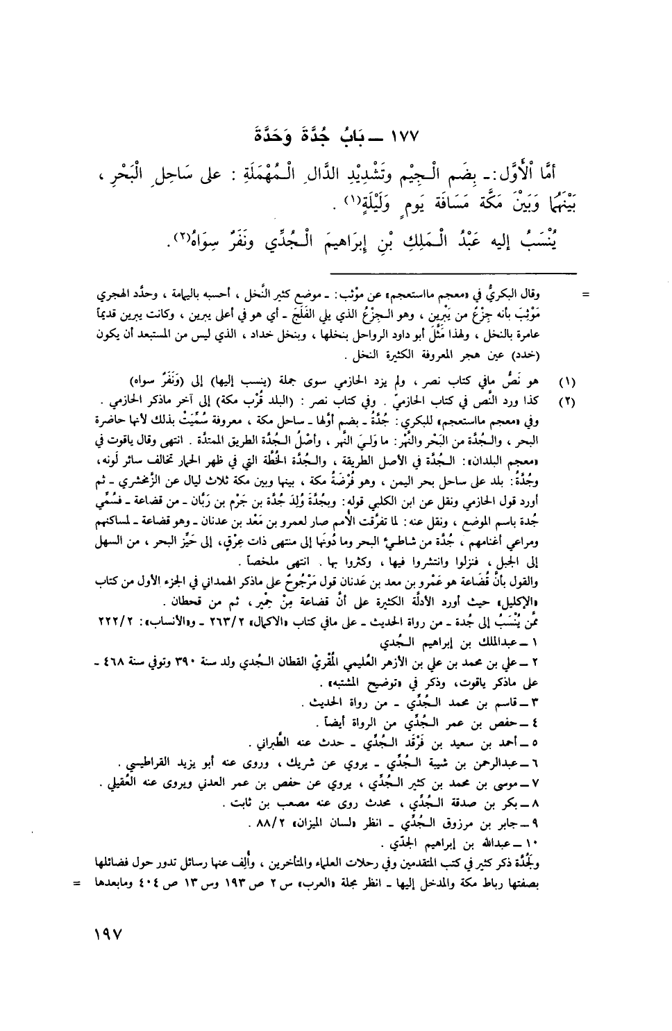 أما اْلأَوَّلُ: - بِضَمِّ الجيم وتَشْدِيْدِ الدال المُهْمَلَة: على ساحل البحر، بينهما وبين مَكَّة مسافة يوم وليلةٍ.