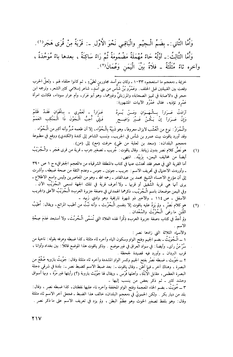 وأما الثَّاني: - بِضَمِّ الجيم والباقي نحو اْلأَوَّلُ -: قَرْيَة من قرى هجر.