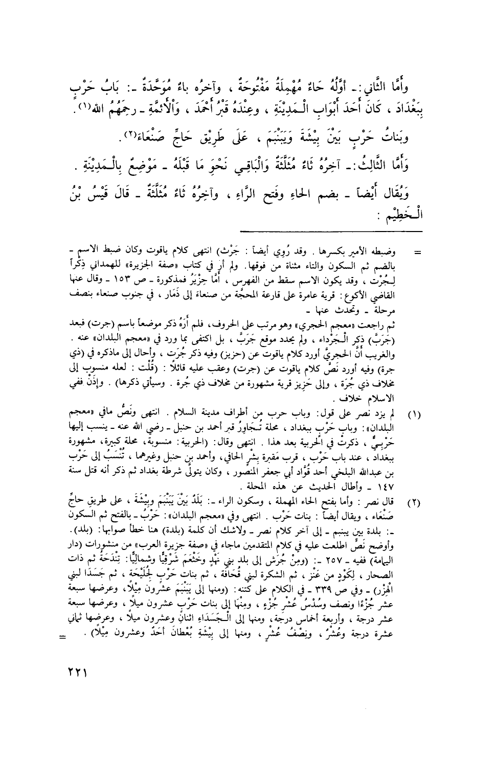 وأما الثَّاني: - أوله حاء مُهْمَلَة مَفْتُوحةٌ، وآخره باءٌ مُوْحَّدَة -: باب حربٍ ببَغْدَاد، كان أحد أَبُواب المدينة، وعنده قبرُ أحمد، والأئمة - رحمهم الله.