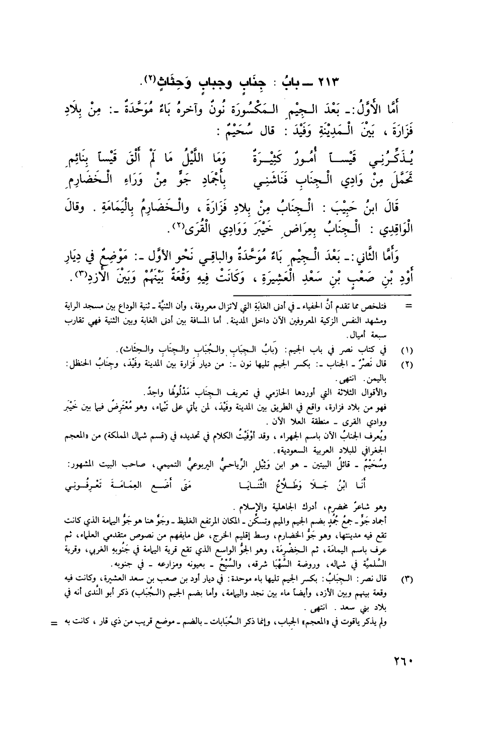 أما اْلأَوَّلُ: - بعد الجيم المَكْسُورَة نُوْن وآخره باءٌ مُوْحَّدَة -: من بلاد فزارة، بين المدينة وفيد: قال سحيمٌ: