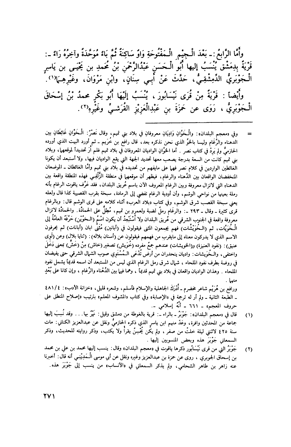 وأما الرَّابع: - بعد الجيم المَفْتُوحةٌ واوٌ سَاكِنَة ثُمَّ باء مُوْحَّدَة وآخره راء -: قَرْيَة بدمشق يُنْسَبُ إليها أَبُو الحسن عبد الرحمن بن مُحَمَّد بن يحيى بن ياسر الجوبري الدمشقي، حدَّث عن أبي سنان، وابن مروان، وَغَيْرِهِمَا.