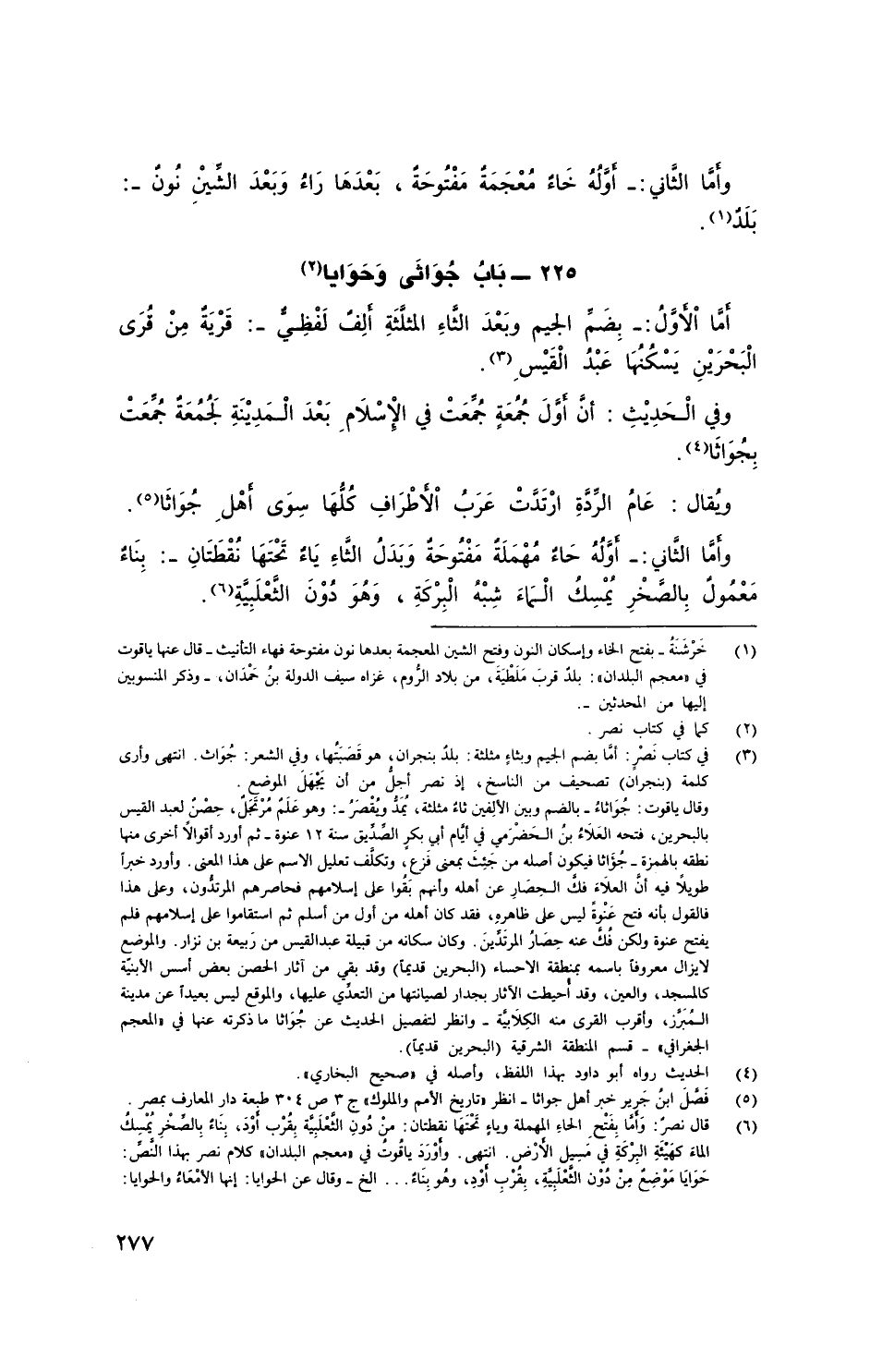 أما اْلأَوَّلُ: - بِضَمِّ الجيم وبعد الثاء المثلثة ألفٌ لفظي -: قَرْيَة من قُرى الْبَحْرَيْن يسكنها عبد القيس.