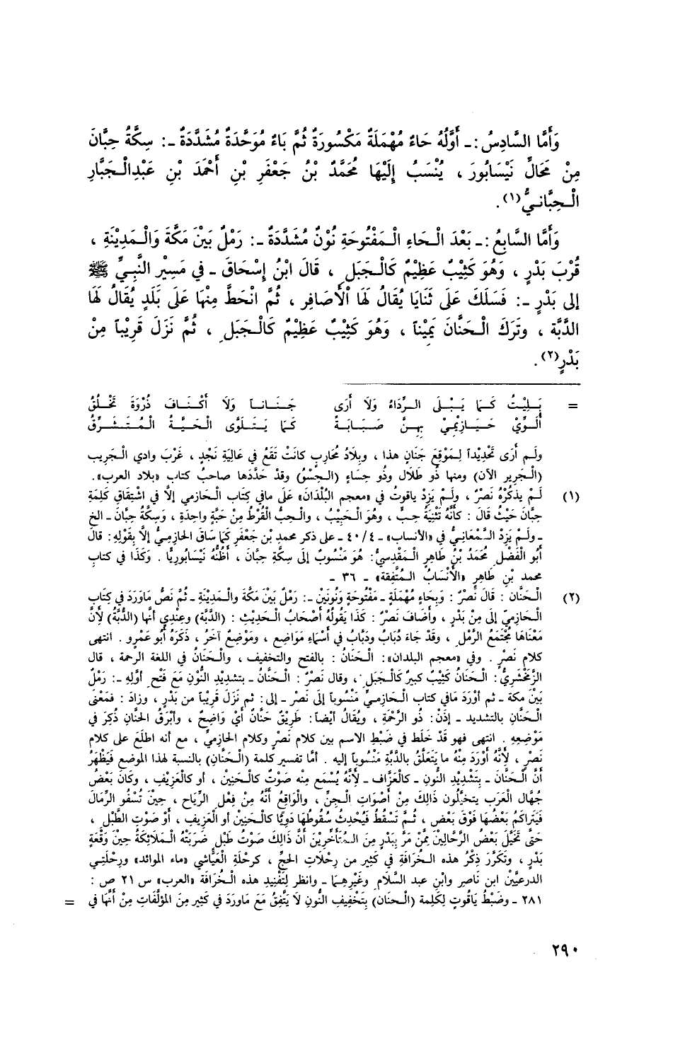 وأما السابع: - بعد الحاء المَفْتُوحةٌ نُوْن مُشَدَّدَة -: رملٌ بين مَكَّة وَالْمَدِيْنَة، قُربَ بدر، وهو كثيب عظيم كالجبل، قال ابن إسحاق - في مسير النَّبِي صَلَّى اللهُ عَلَيْهِ وَسَلَّمَ إلى بدر -: فسلك على ثنايا يُقَالُ لها الأصافر، ثُمَّ انحط منها على بلد يُقَالُ لها الدبة، وترك الحنان يميناً، وهو كثيب عظيم كالجبل، ثُمَّ نزل قريباً من بدرٍ.