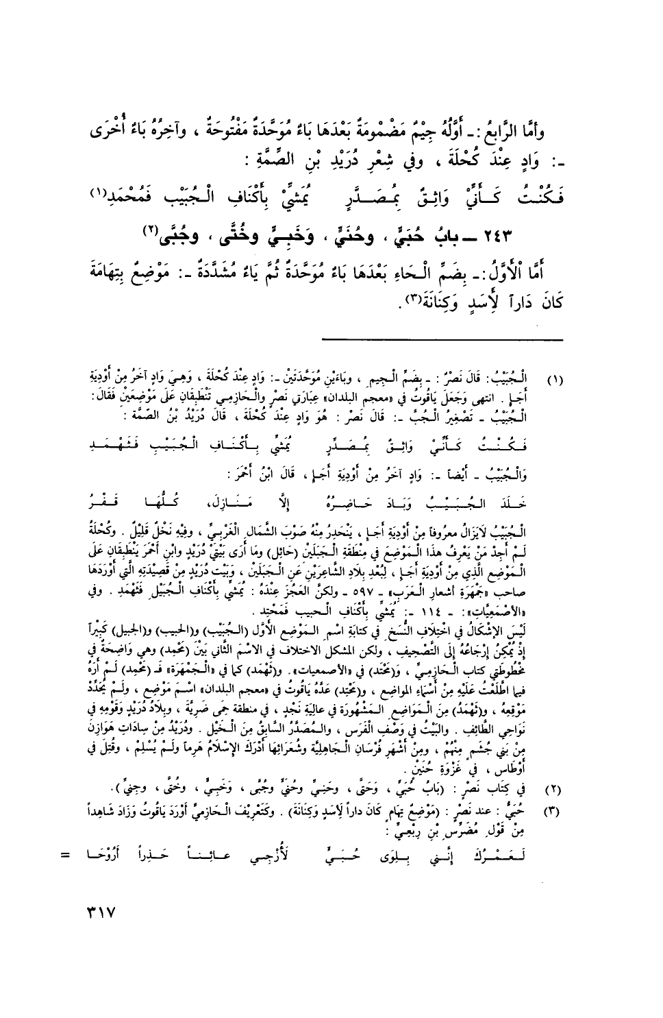 وأما الرَّابع: - أوله جيم مَضْمُومَة بَعْدَهَا باءٌ مُوْحَّدَة مَفْتُوحةٌ، وآخره باء أخرى -: وادٍ عند كُحْلة، وفي شعر دُريد بن الصمة: