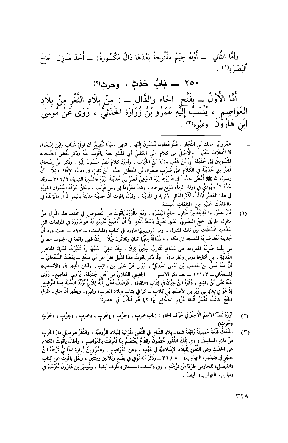 أما اْلأَوَّلُ - بِفَتْحِ الحاء والدال -: من بلاد الثغر من بلاد العواصم، يُنْسَبُ إِلَيْهِ عمرو بن زُرارة الحدثي، روى عن موسى ابن هارون وغيره.