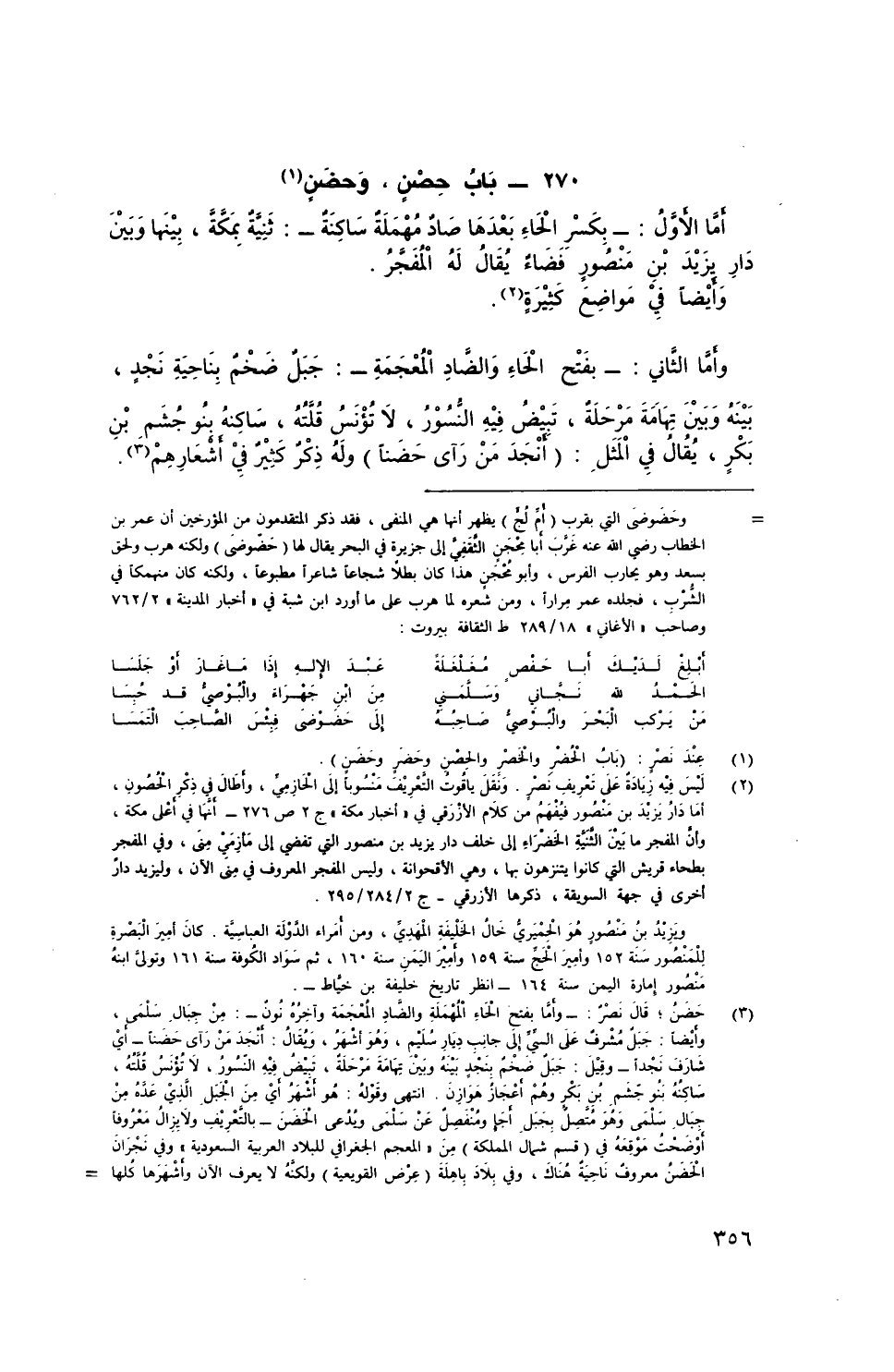 أما اْلأَوَّلُ: - بِكَسْرِ الحاء بَعْدَهَا صادٌ مُهْمَلَة سَاكِنَة -: ثنية بمَكَّة، بينها وبين دار يزيد بن منصور فضاء يُقَالُ له المفجر.