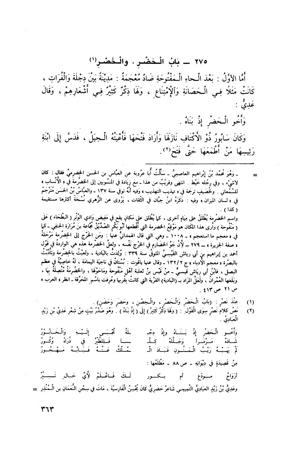 أما اْلأَوَّلُ: - بعد الحاء المَفْتُوحةٌ ضاد معجمة: مدينة بين دِجْلَة والفرات، كانت مثلاً في الحصانة والإمتناع، ولها ذكر كثير في أشعارهم، وقال عدي: وأخو الحضر إذ بناه.