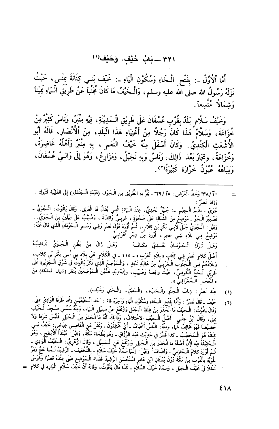 أما اْلأَوَّلُ -: بِفَتْحِ الْخَاءِ وسكون الياء -: خيف بني كِنَانَة بمنى، حيث نزله رَسُوْل الله صَلَّى اللهُ عَلَيْهِ وَسَلَّمَ، والخيف ما كان مُجنباً عن طريق الماء يميناً وشمالاً متسعاً.