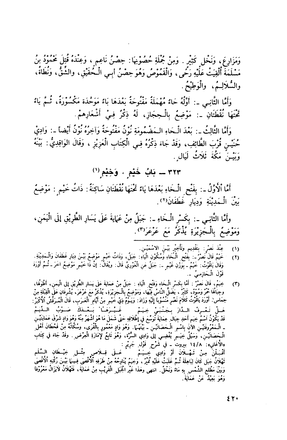 أما اْلأَوَّلُ -: بِفَتْحِ الْخَاءِ بَعْدَهَا ياء تَحْتَهَا نُقْطَتَان سَاكِنَة: ذات خيم: مَوْضِعٌ بين المدينة ودِيَارِ غطفان.