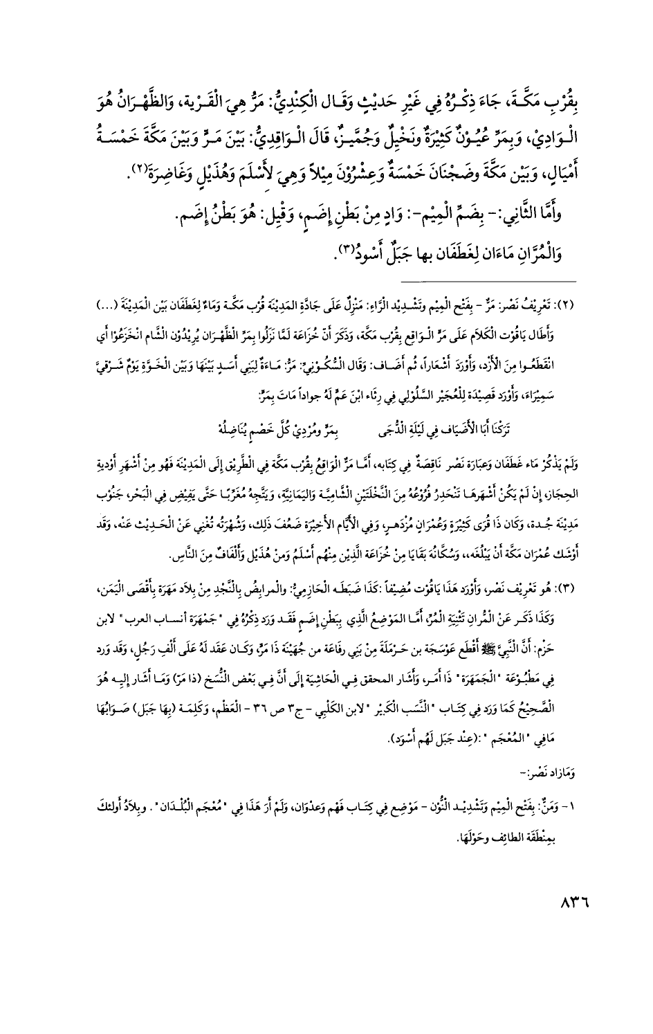 بقُربَ مَكَّة، جاء ذكره في غير حديث وقال الكندي: مر هي القَرْيَة، والظهران هو الودي، وبمر عيون كثيرةٌ ونخيل وجميز، قال الواقدي: بين مر وبين مَكَّة خمسة أميال، وبين مَكَّة وضجنان خمسةٌ وعشرون ميلاً وهي لأسلم وهُذيل وغاضرة.
