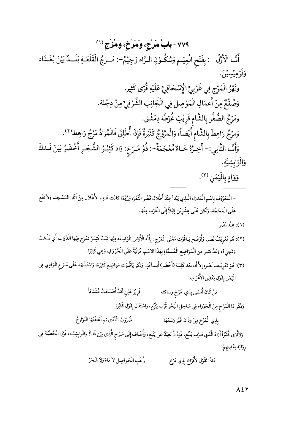 أما اْلأَوَّلُ -: بِفَتْحِ الميم وسكون الراء وجيم -: مرج القلعة بلد بين بَغْدَاد وقرميسين.