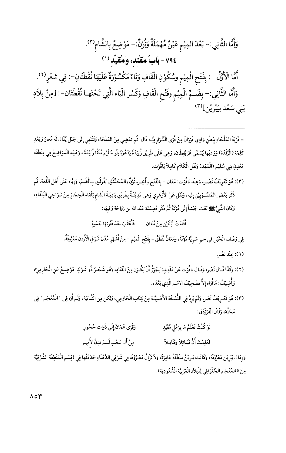 وأما الثَّاني: - بِضَمِّ الميم وفتح القاف وكسر الياء التي تَحْتَهَا نُقْطَتَان -: [من بلاد بني سعد بيبرين] .