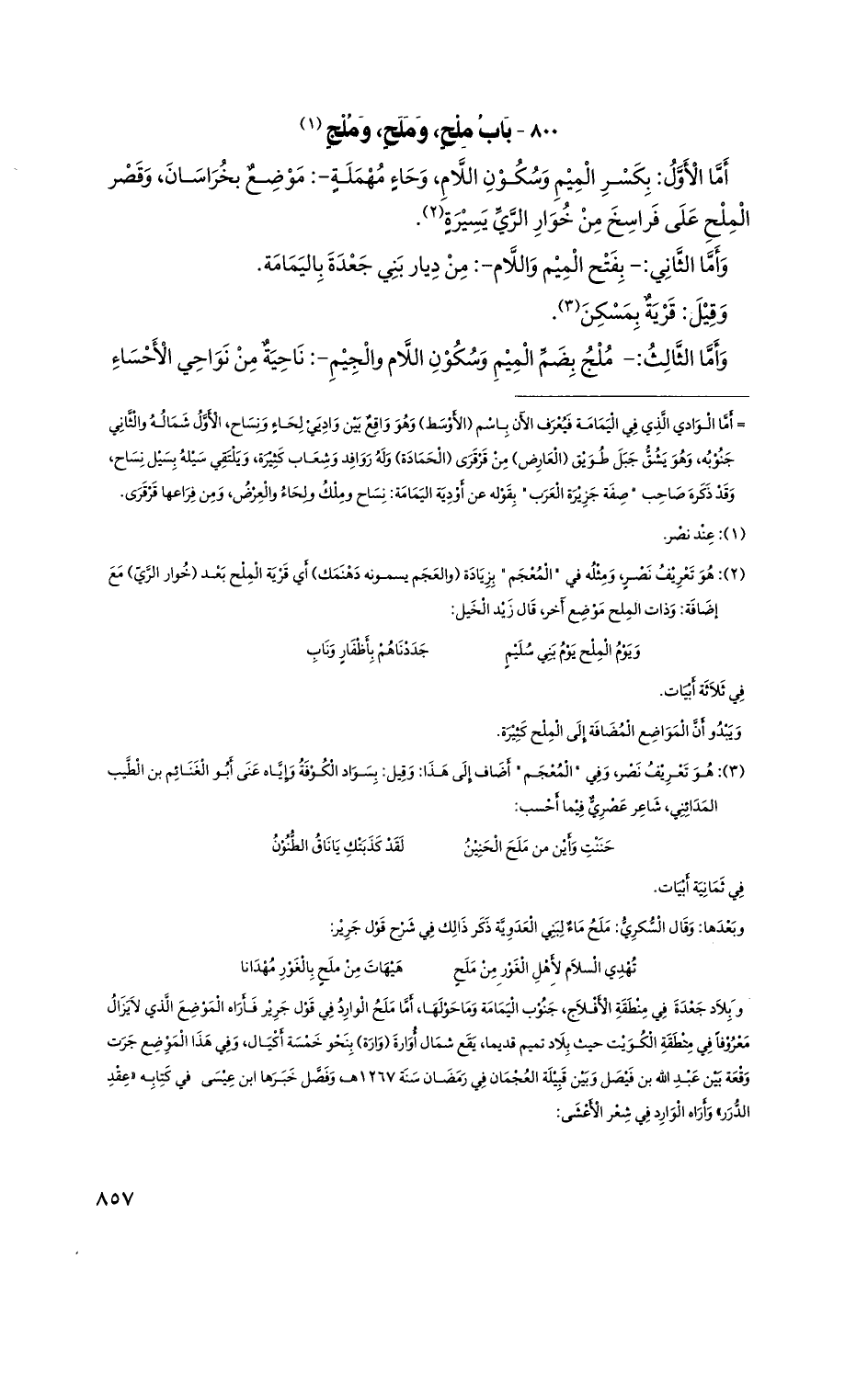وأما الثَّالِثُ: - ملجُ بِضَمِّ الميم وسكون اللام والجيم -: ناحية من نواحي الأحساء