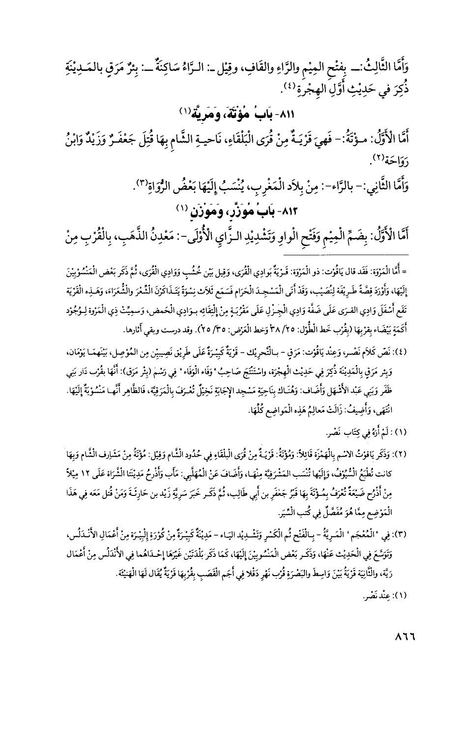 أما اْلأَوَّلُ: مؤتة: - فهي قَرْيَة من قُرى البلقاء، ناحية الشام بها قتل جعفر وزيد وابن رواحة.